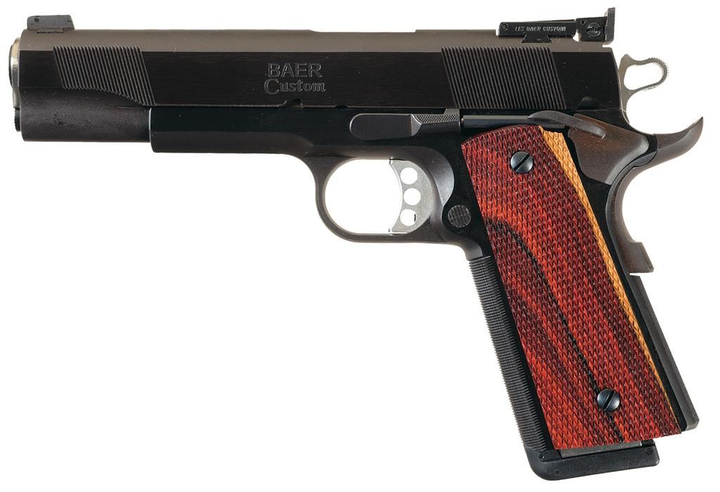 Fixed blade high rise front target sight, fully adjustable target rear sight, extended thumb safety, beavertail grip safety, flat serrated mainspring housing, checkered front strap, checkered slide stop, three hole aluminum trigger, skeletonized hammer. With box numbered to the gun and extra magazine, Les Baer patch, manual, and Shooting USA DVD.