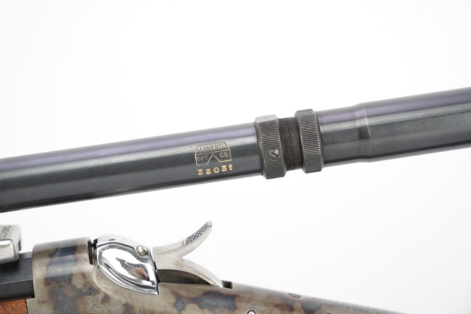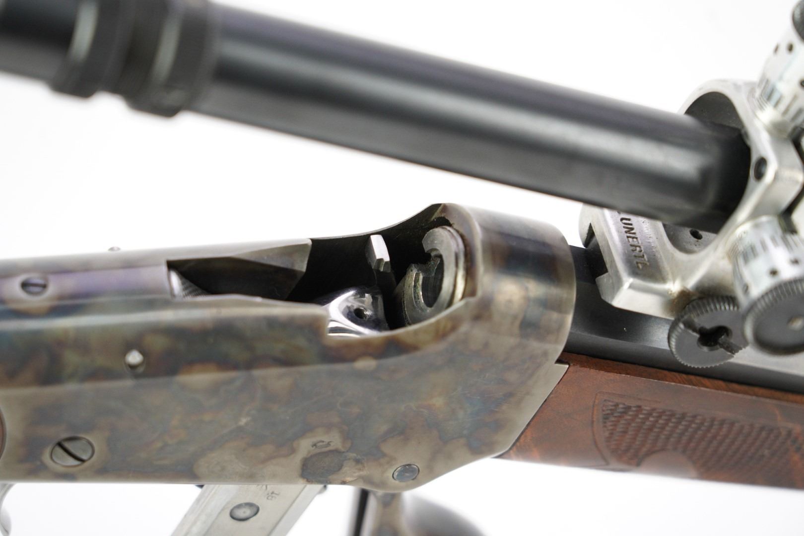 Overall Condition: This rifle retains about 97% of its current metal finish. The balance is mostly some light thinning in the frame’s otherwise strong case color. There are some scattered light handling marks. The screw heads are sharp. The markings are clear. Overall, this rifle rates in about excellent condition as customized.