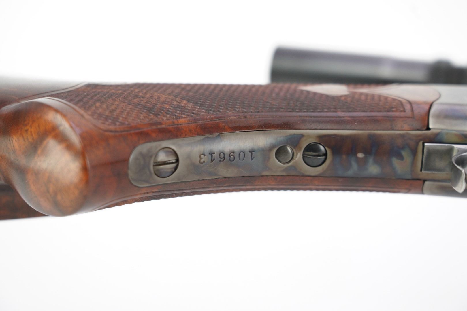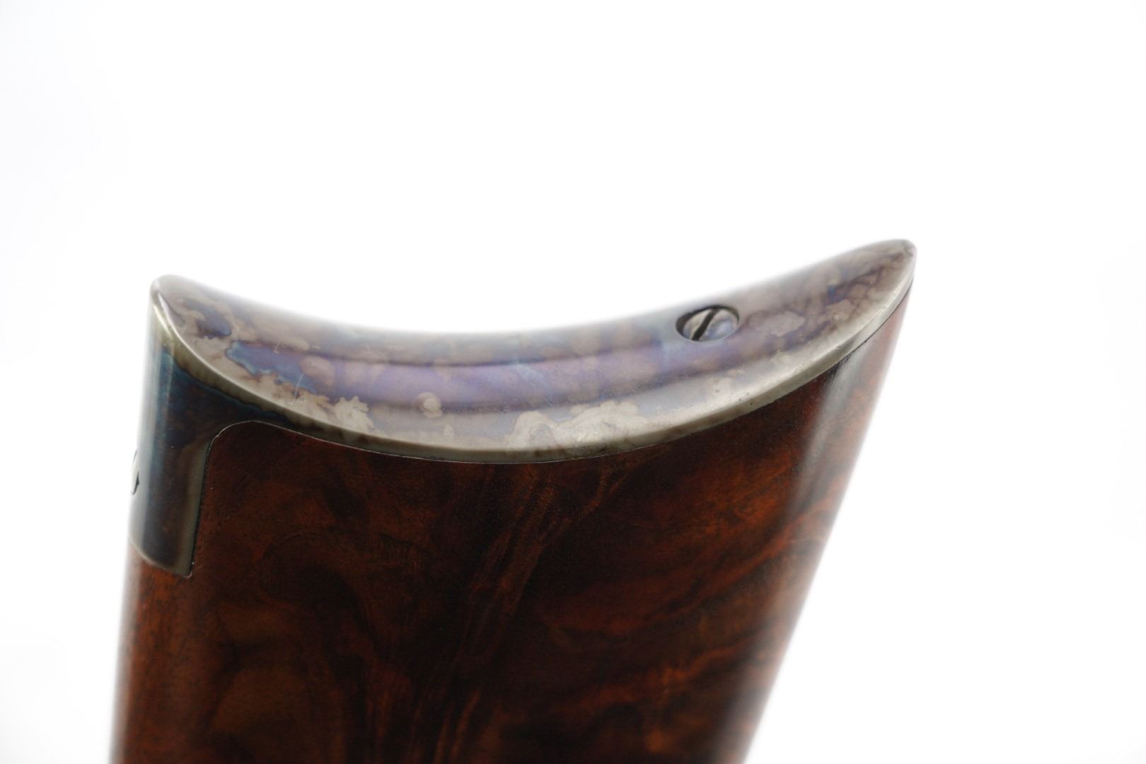 Stock Configuration & Condition: The stocks are two-piece checkered deluxe walnut. The schnabel-tip forend has a triangular ebony inlay in the nose. The pistol grip stock has a straight comb, shadow-line cheekpiece and casehardened steel crescent buttplate. The stocks have a few light marks. The checkering is well defined. There are no chips or cracks. The LOP measures 13" from the front of the trigger to the back of the buttplate. The stocks rate in about excellent overall condition as not original to the gun.