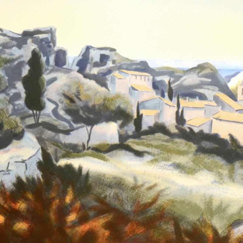 "Les Baux" is a limited edition lithograph on paper by Victor Zarou, numbered and hand signed by the artist! Measures approx. 29.5" x 21" (border). 23" x 18" (image).