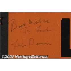 <B>Les Brown Signed Window Card.</B></I> Les Brown was playing soprano sax professionally by age nine, and at age 14, he was fronting his own band. "Les Brown and His Band of Renown" became immensely popular, appeared in many films, and in 1950, began a long association with Bob Hope. Brown led a swinging band, and by the time he died in 2001, he was beloved the world over. This orange card features musical notes across the top and bottom and is signed, "Best Wishes to (name unknown) Les Brown." Pin holes at each corner. <I>Accompanied by COA from Jazz & Big Band expert Larry Rafferty.</B></I> <BR><BR><B>Important notice:</B> Heritage usually auctions material at the rate of 200-250 lots per hour. On some occasions eBay Live bid software or the Internet may not be able to keep up with the pace of the auction. We recommend placing a realistic absentee bid now as insurance to avoid disappointment. Occasionally the auctioneer may eliminate or reject an eBay Live bid, and the auctioneer may also reopen a lot after the close of the eBay live bidding (usually because we missed an audience bid), and may reject your bid even if it shows you as the winning bidder. By bidding via eBay Live, you agree that Heritage may award the lot to another bidder at its sole discretion under the circumstances described above or any other reasonable circumstances. Since eBay bids are not shown to us until we open the lot on the floor, we treat those bids just like floor bids. In most cases the floor responds before the eBay bid is presented to us, due to Internet lag time, so for consistency we have made it a policy that floor bids are always considered first over tie eBay live bids. Also please note that all Heritage lots purchased through eBay Live carry a 24.5% Buyer's Premium. Please make sure you read the Terms and Conditions before you bid.