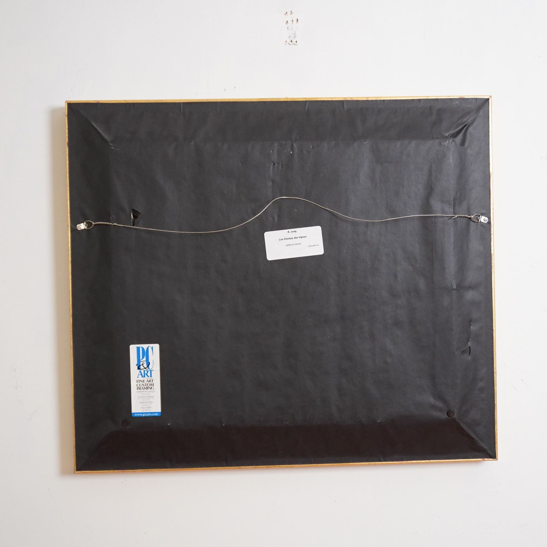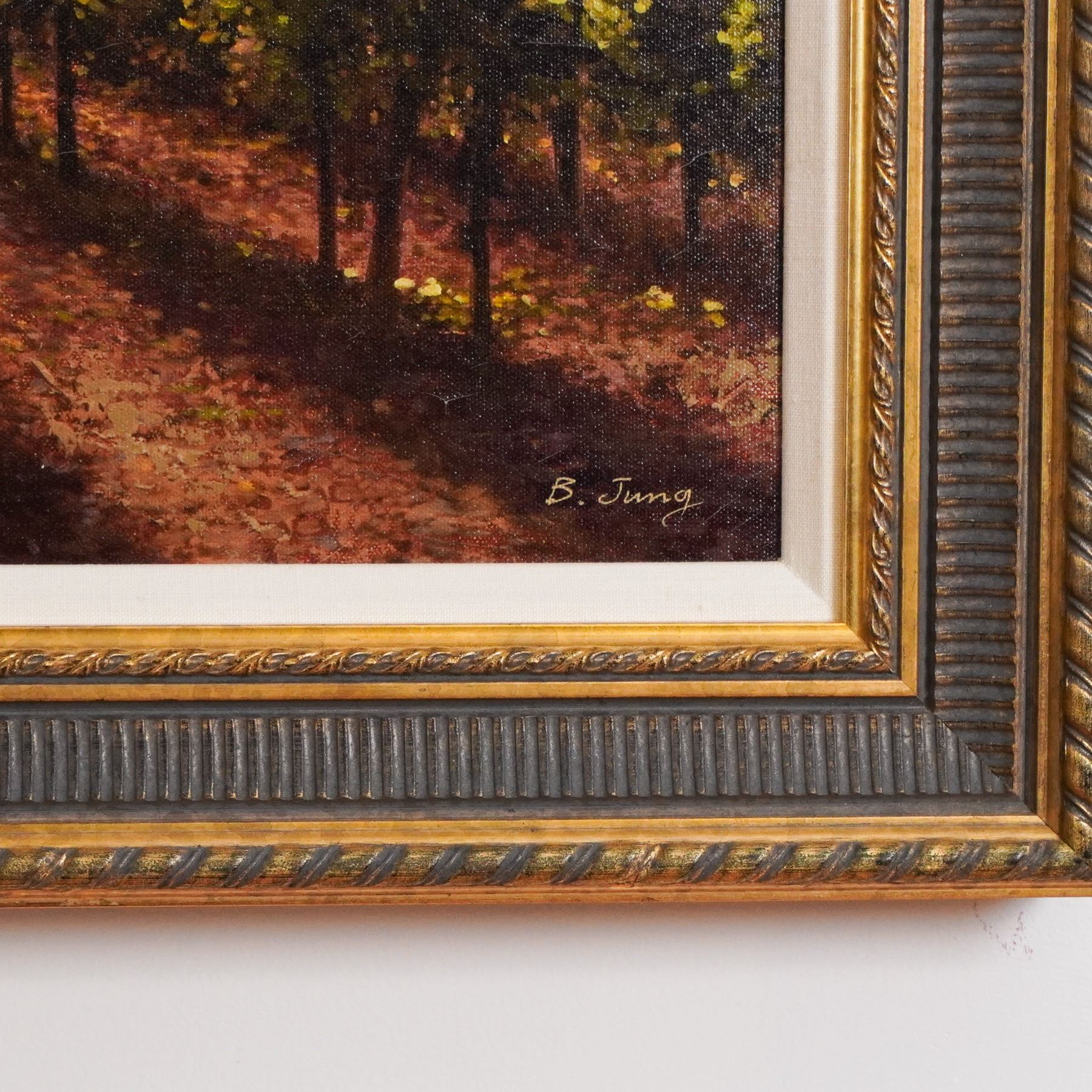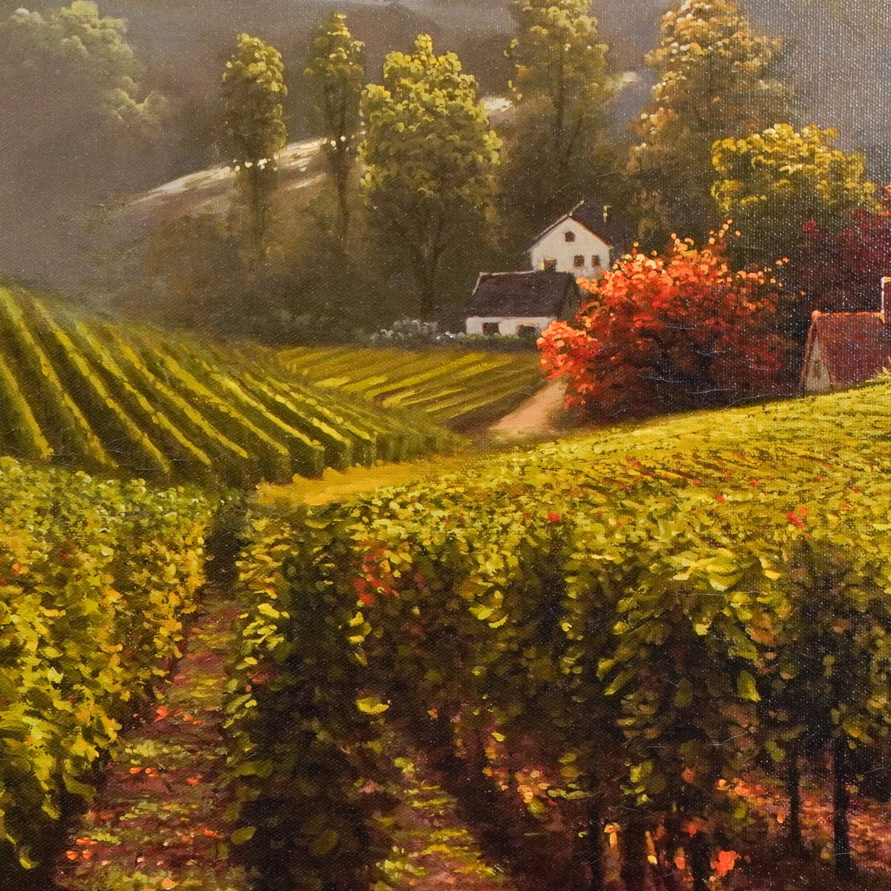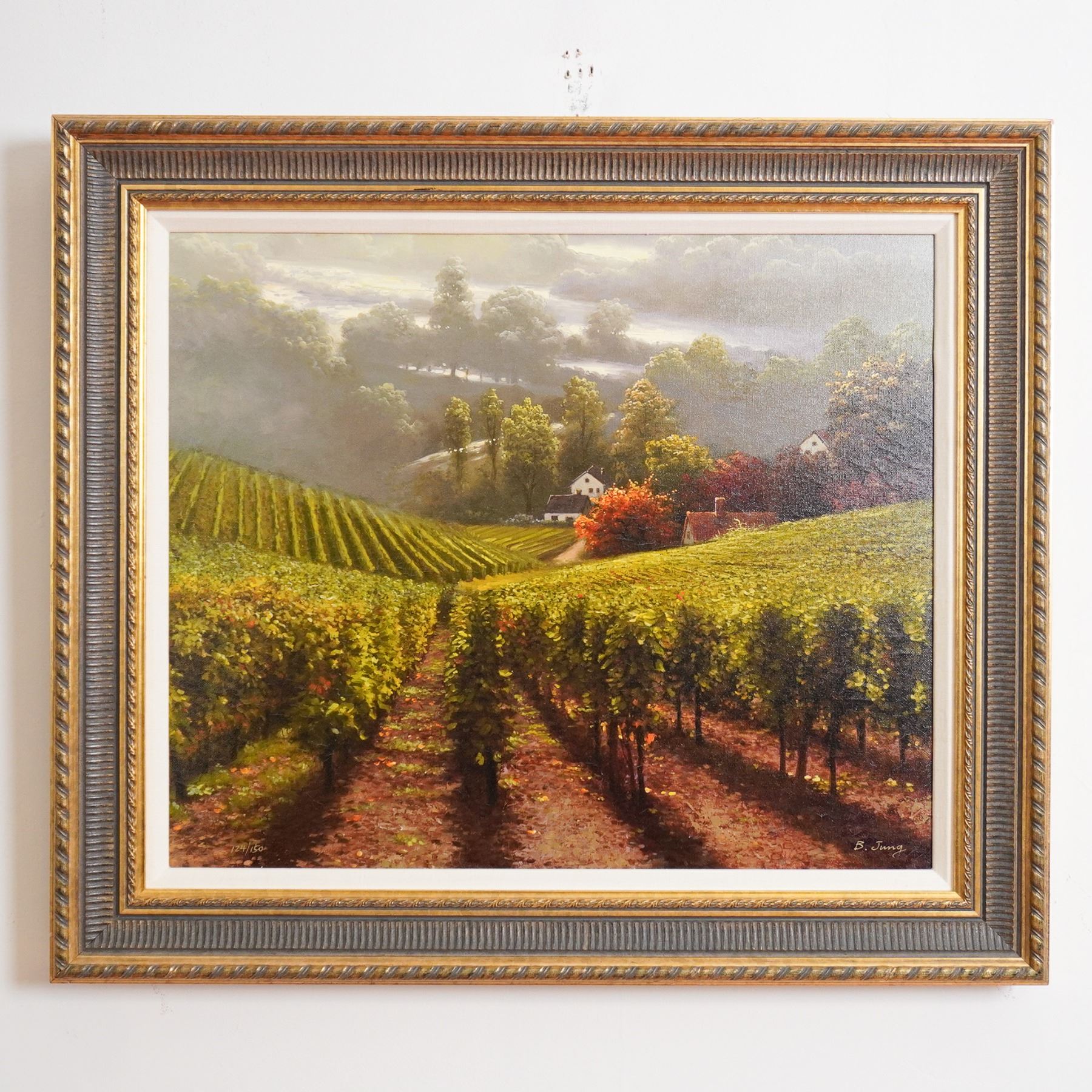 A stunning limited edition giclee on canvas titled Les Champs des Vignes, signed in the lower right corner by the artist, B. Jung. This piece captures the beauty of lush vineyard rows leading to a quaint countryside estate, evoking a serene European landscape. Numbered 124 of 150, this high-quality reproduction brings the warmth of autumnal hues to life with exquisite detail and depth. Elegantly framed with a decorative gold and black border, this artwork is ready to enhance any collection or living space.Measures 30.25"L x 26.25"H.