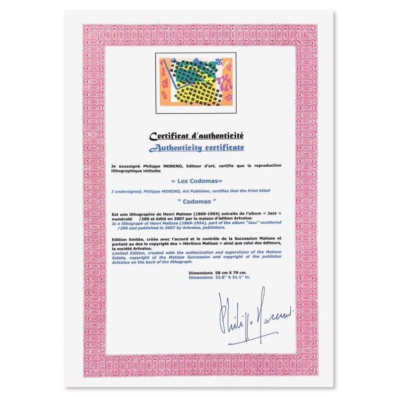 "Les Codomas" is a limited edition lithograph by Henri Matisse (1869-1954). This piece comes from an edition of 200 authorized by the Matisse Estate; the edition number is not on the piece itself but on the certificate. This piece comes custom framed. Includes Certificate of Authenticity. Measures approx. 37" x 29" (frame), 31" x 23" (image).