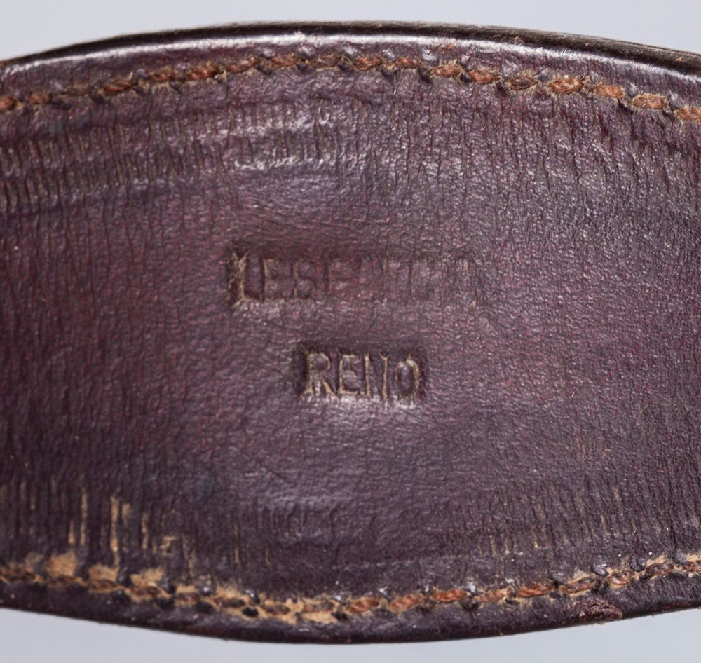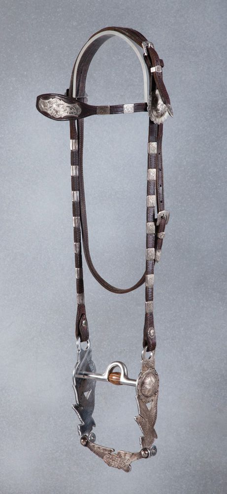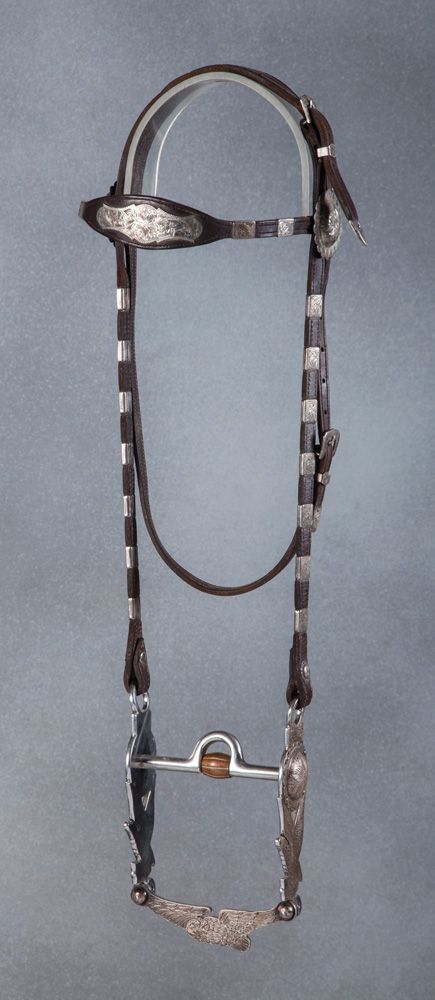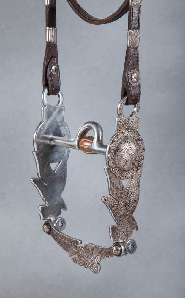 Les Garcia Headstall with Eagle Bit. Les Garcia, Reno maker-marked (inside of browband) silver mounted headstall with engraved flat ferrules on the cheeks, scalloped sterling conchos, and silver buckles supporting a finely engraved silver overlaid eagle port bit with copper cricket. Circa 1960s, in excellent, usable condition.