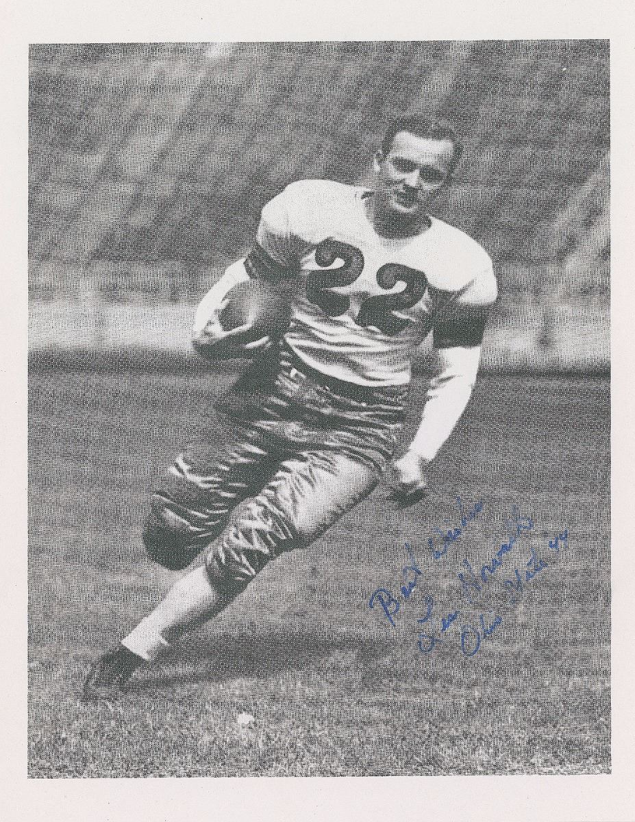 College Football Hall of Famer (1921–1995) and winner of the 1944 Heisman Trophy. Ideal 8.5 x 11 cardstock photo of the Buckeyes’ star quarterback, signed in blue felt tip, “Best Wishes, Les Horvath, Ohio State ‘44.” In fine condition.