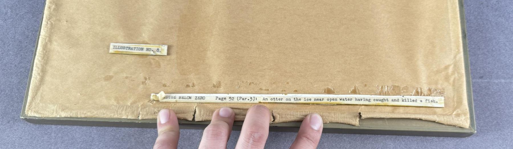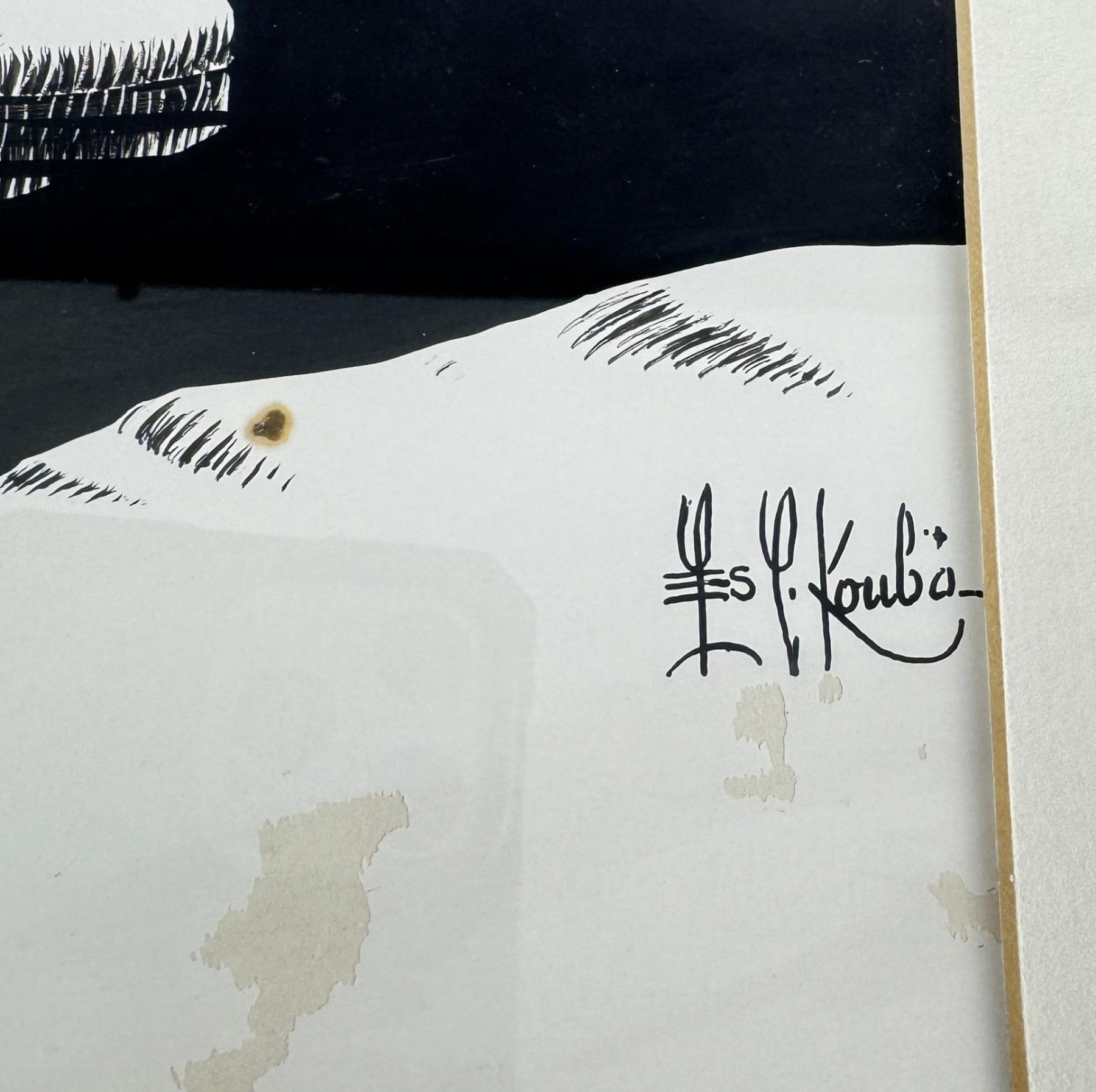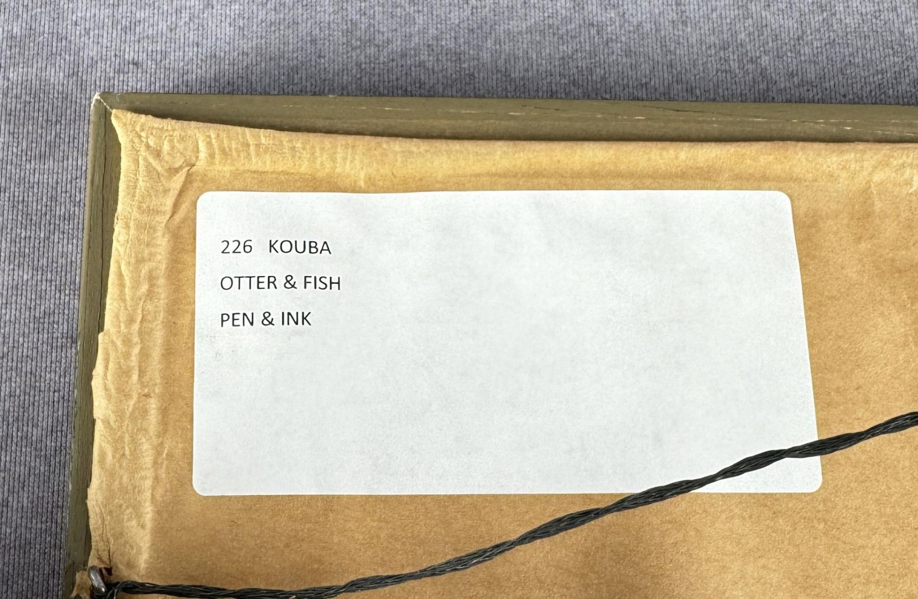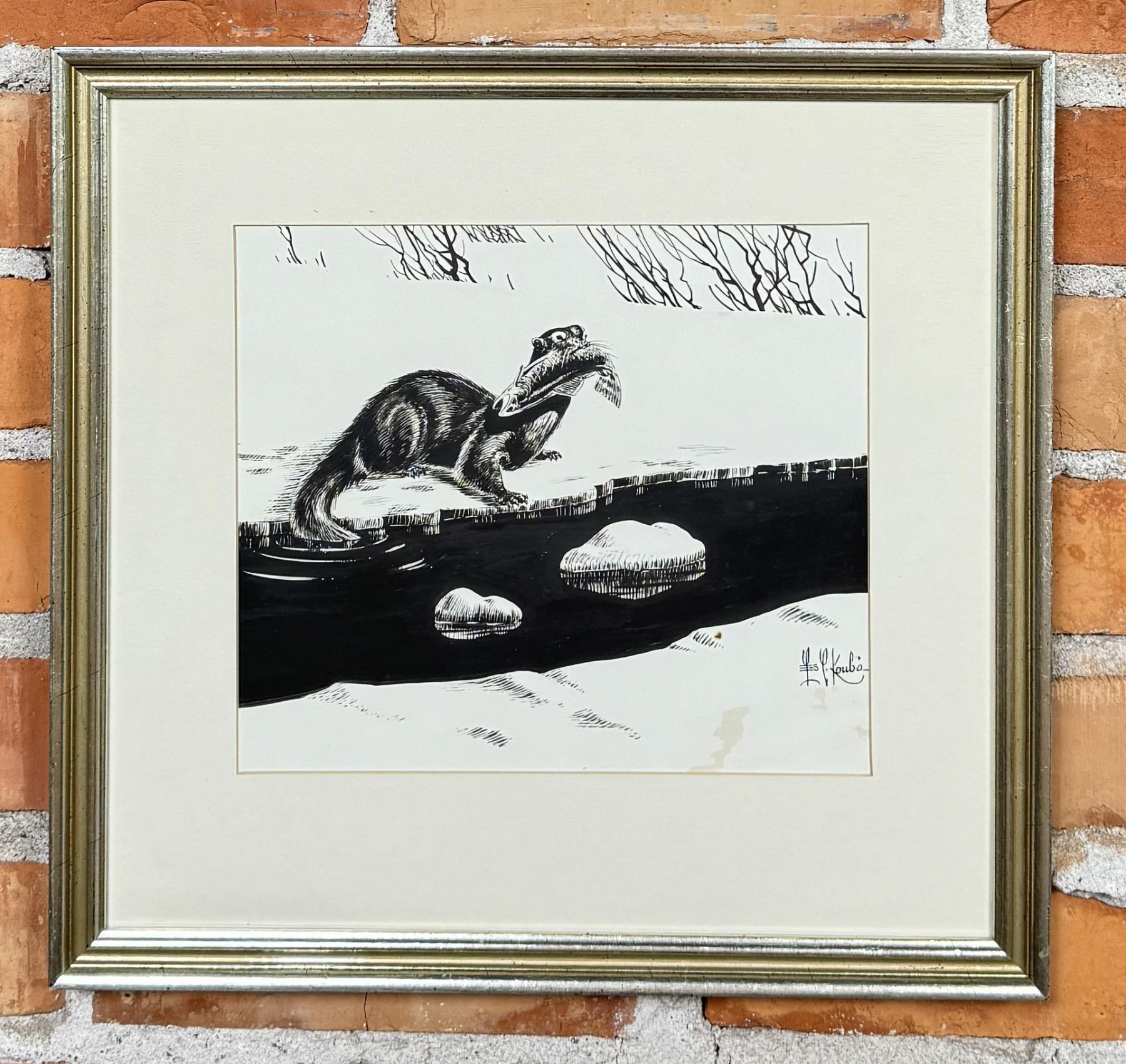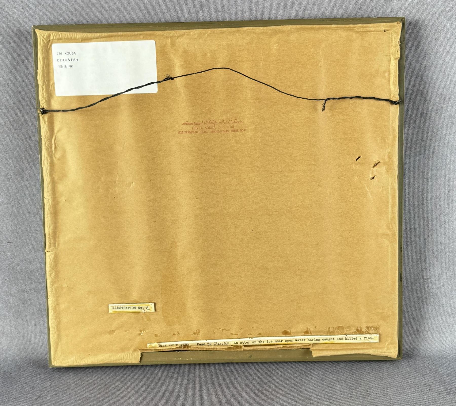 Pen and Ink on Paper. Title is Otter & Fish. Illustrated and Published for Paradise Below Zero, Calvin Rutstrum, Page 52 Paragraph 3. 13 5/8" by 14 3/8" framed. Leslie C. Kouba (1917 - 1998) was active/lived in Minnesota. Leslie Kouba is known for Wildlife in landscape painting.