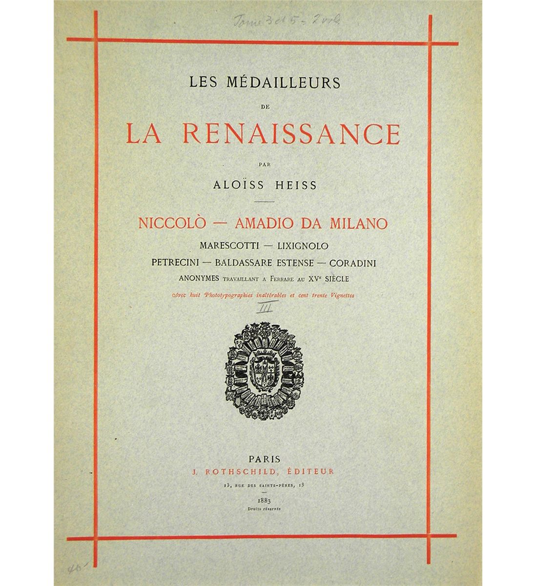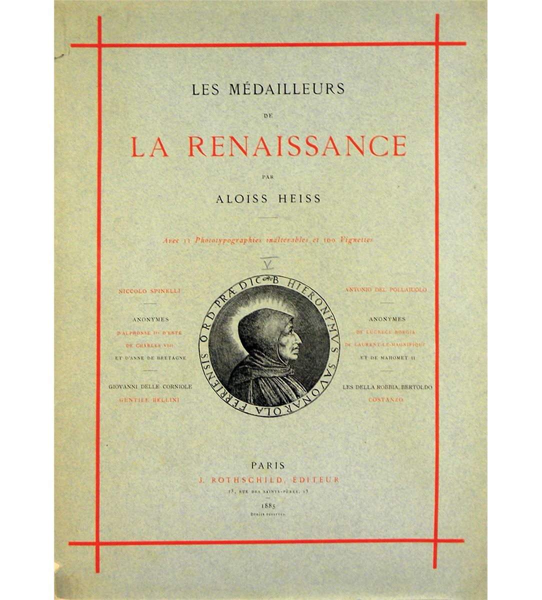 Heiss, Aloïss. LES MÉDAILLEURS DE LA RENAISSANCE. (TOME III): NICCOLÒ -- AMADIO DA MILANO -- MARESCOTTI -- LIXIGNOLO -- PETRECINI -- BALDASSARE ESTENSE -- CORADINI. ANONYMES TRAVAILLANT À FERRARE AU XVE SIÈCLE. Paris: J. Rothschild, 1883. 60 pages; text illustrations; 8 fine plates of medals. [with] Heiss, Aloïss. LES MÉDAILLEURS DE LA RENAISSANCE. (TOME V): NICCOLÓ SPINELLI. ANONYMES D'ALPHONSE IER D'ESTE, DE CHARLES VIII ET D'ANNE DE BRETAGNE. GIOVANNI DELLE CORNIOLE, GENTILE BELLINI. ANTONIO DEL POLLAIUOLO. ANONYMES DE LUCRÈCE BORGIA, DE LAURENT LE MAGNIFIQUE ET DE MAHOMET II. LES DELLA ROBBIA, BERTOLO COSTANZO. Paris: J. Rothschild, 1885. 88 pages; text illustrations; 11 fine plates. Two volumes. Folio [40 by 29 cm], original printed wraps. Wraps worn, with tape repairs; contents unopened and fine. The third and fifth volumes of the great foundational work on Italian Renaissance medals. Only 200 numbered copies of the later volumes were issued, and presumably, similar quantities were issued of the earlier volumes. Very rarely offered even in single numbers. Clain-Stefanelli 14282*.