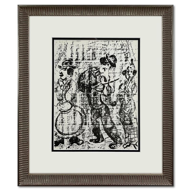 "Les Musiciens Vagabonds" is a lithograph on paper by Marc Chagall (1887-1985). This piece comes custom framed. Includes Letter of Authenticity. Measures approx. 17" x 20" (frame), 9" x 12.5" (image).