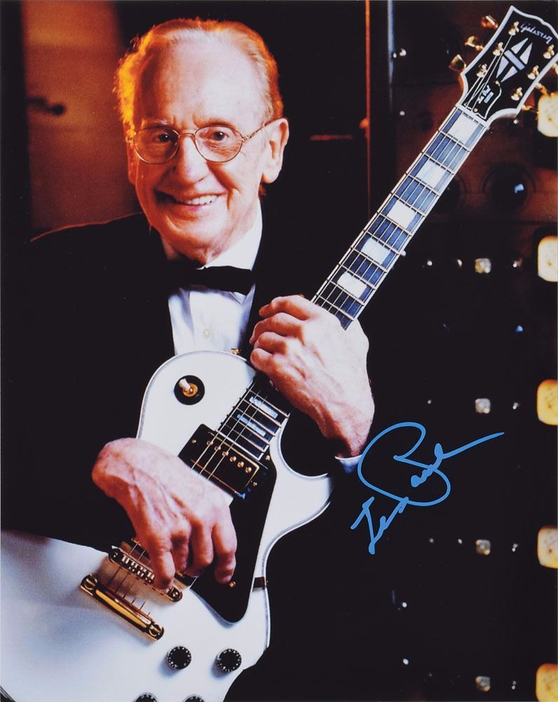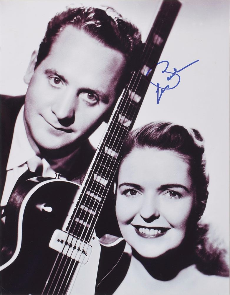 Two photos: a color glossy 11 x 14 photo of Les Paul holding his guitar in later age, signed in bright blue paint pen; and a glossy 11 x 14 photo of Paul posing with Mary Ford, signed in blue felt tip by Paul. In overall fine condition.