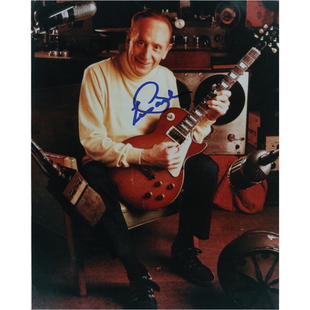 Color satin-finish 8 x 10 photo of Les Paul with one of his namesake guitars, nicely signed in blue felt tip. In fine condition. Originally obtained by in-person specialist Mike Wehrmann.
