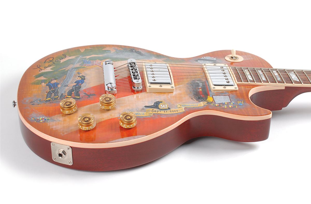 One-of-a-kind Les Paul Standard Plus electric guitar personally-owned by Les Paul and donated by him for a New York charity auction fundraiser for the families lost in the tragic attacks of September 11, 2001. Known as ‘The 9/11 Les Paul,’ the beautiful premium maple flamed top was painted by retired NYC fireman Paul Ortel to honor the occasion, rendering a poignant scene against an American flag background, most prominently featuring two firefighters planting a flag at Ground Zero, as well as firemen in a ladder bucket fighting the fire, a badge draped in a mourning ribbon, a candlelight vigil, and a banner reading, “New York’s Bravest, Sept. 11, 2001.” The black backplate was signed and inscribed in silver ink to the original purchaser, “To Mark, Keep Pickin’!, Les Paul.” In fine condition. Accompanied by the original Gibson hardshell case as well as a packet of provenance information including news articles about the charity auction with photos of Mayor Michael Bloomberg holding the guitar and a letter from the Gibson company.