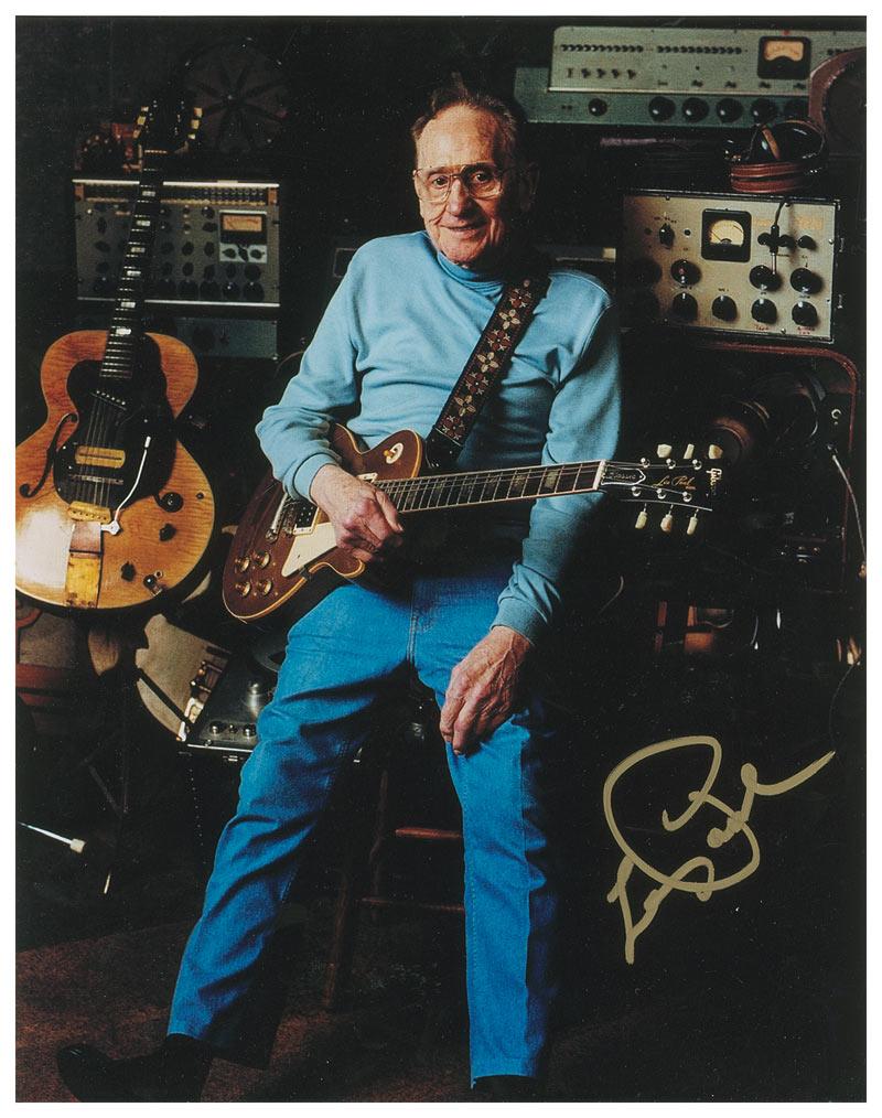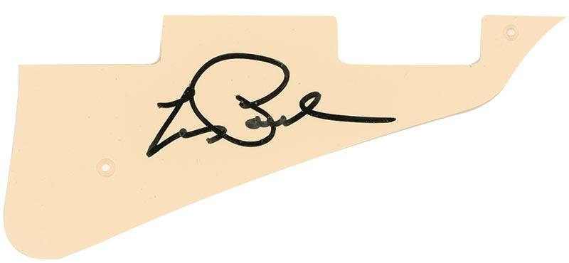 Two items: satin-finish 11 x 14 photo of Les Paul with his guitars, signed in gold ink, “Les Paul”; and an ivory-colored pickguard for a ‘Les Paul-style’ guitar, signed in black felt tip, “Les Paul.” In fine condition. Accompanied by a photo taken at time of signing of the pickguard.