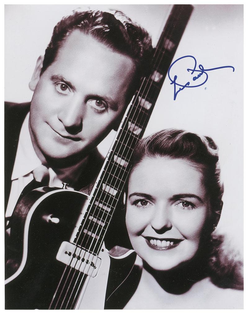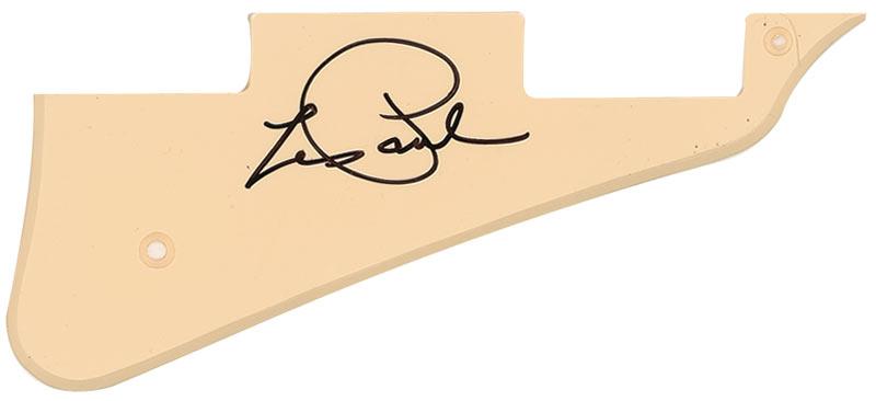 Two items: satin-finish 11 x 14 photo of Les Paul and Mary Ford, signed in blue felt tip, “Les Paul”; and an ivory-colored pickguard for a ‘Les Paul-style’ guitar, signed in black felt tip, “Les Paul.” In fine condition. Accompanied by a photo taken at time of signing of the pickguard.