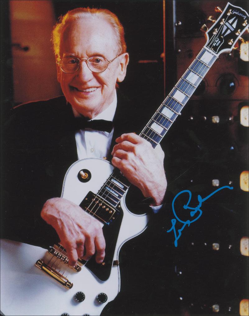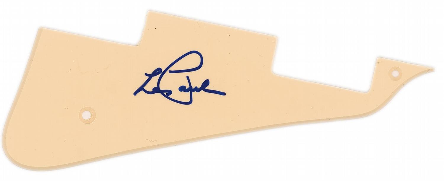 Two items: color glossy 11 x 14 photo of Paul holding his guitar, signed in blue ink, and an ivory-colored pickguard for a Les Paul-style guitar, signed in blue felt tip. In fine condition.