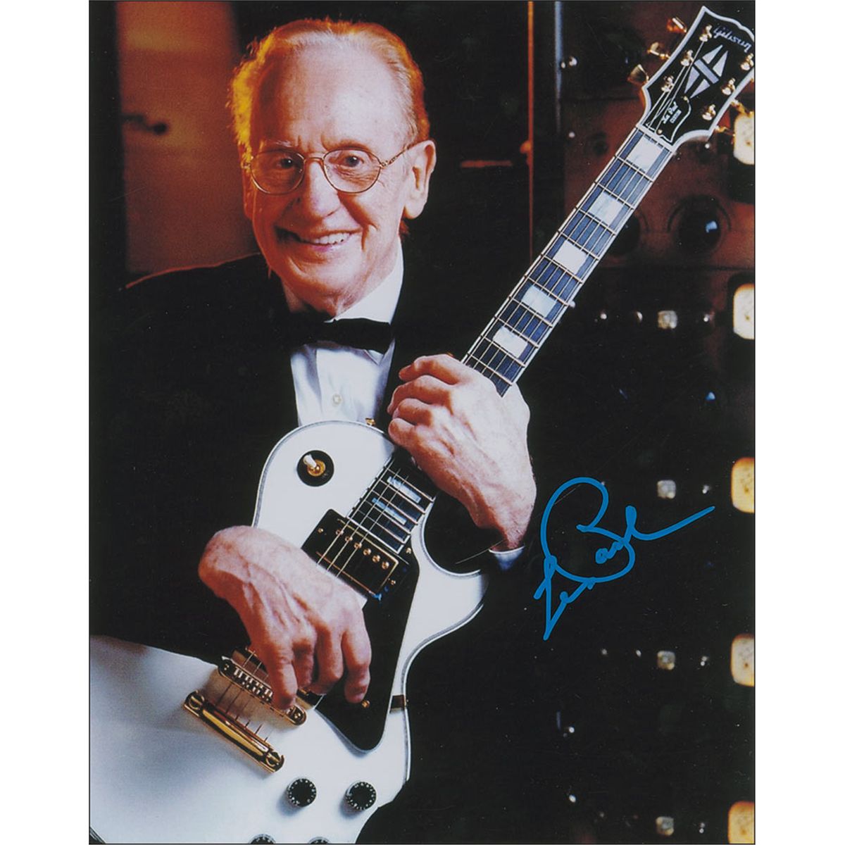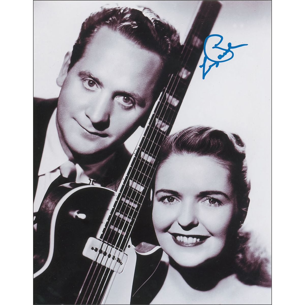 Two glossy 11 x14 photos: one of Paul and Mary Ford, and one of the tuxedo-clad Paul holding a guitar, both signed in blue ink. In fine condition.