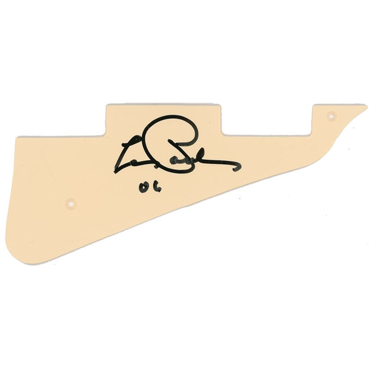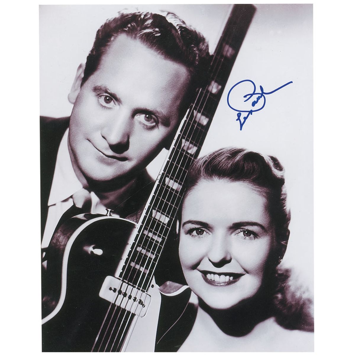 Two items: satin-finish 11 x 14 photo of Paul and Mary Ford, signed in blue felt tip, and an ivory–colored pickguard for a Les Paul style guitar, signed in black felt tip, “Les Paul 06.” In fine condition.