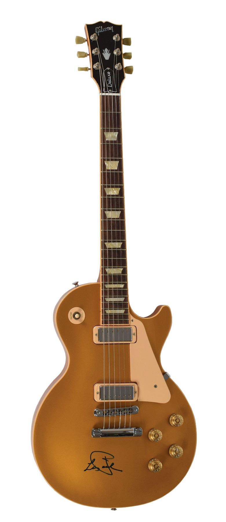 Remarkable Gibson USA Les Paul Deluxe electric guitar with a classic goldtop finish, serial no. 005270411, signed on the front in black felt tip, "Les Paul," and signed twice on the reverse, "I invented this guitar in 1951, Les Paul. This gold was the color of my car—my favorite color. Les Paul. Glad you asked—yes I invented multitrack record." In fine condition. Accompanied by a Gibson hardshell case. The consignor, a friend of Les Paul, notes that this guitar was signed in person at the Iridium Jazz Club in Manhattan circa 2008. This guitar can be said to represent a 'mystery solved' for guitar enthusiasts, who have long wondered why the Les Paul was initially released in gold. According to Gibson, Paul wanted a gold finish as 'it looks expensive.' Here, he offers another reason—it was his favorite color, and the color of his car.