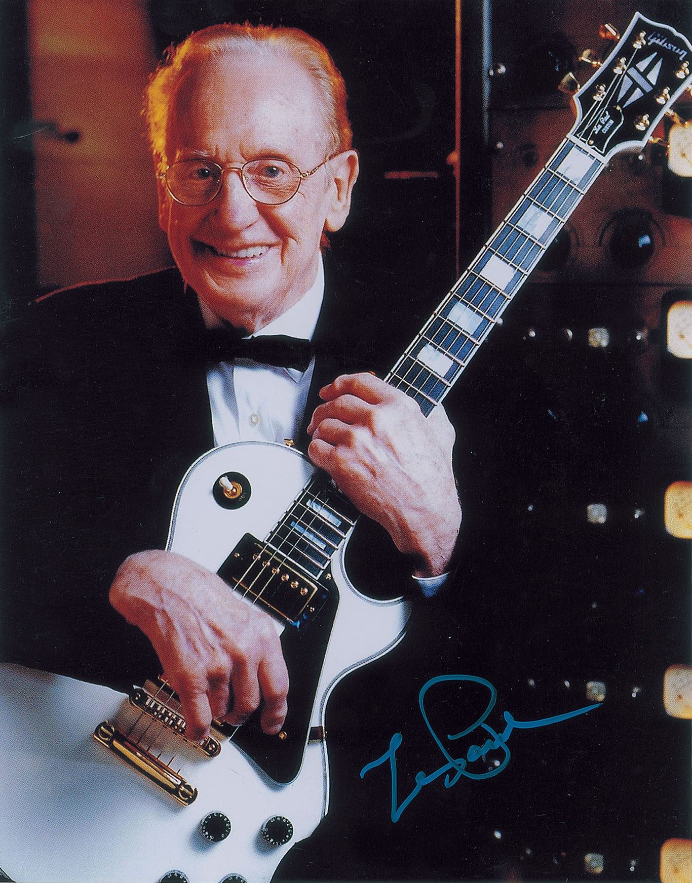 Color satin-finish 11 x 14 photo of Les Paul posing with one of his trademark electric guitars, signed in blue paint pen. In fine condition, with a few small surface creases, one of which touches his ear.