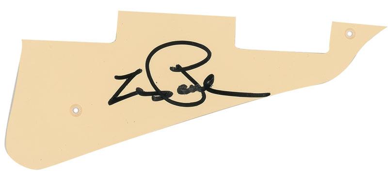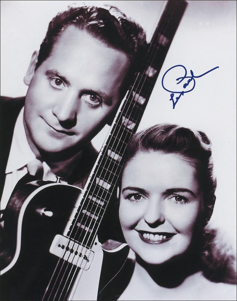 Two items: satin-finish 11 x 14 photo of Les Paul and Mary Ford, signed in blue felt tip; and an ivory-colored pickguard for a Les Paul guitar, also signed in black felt tip. In fine condition. RRAuction COA.