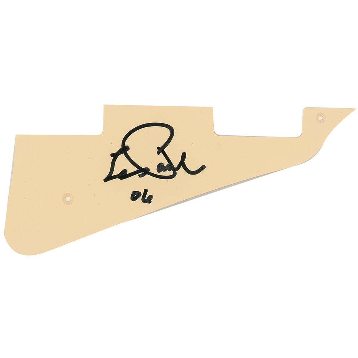 Two items: satin-finish 11 x 14 photo of Les Paul and Mary Ford, signed in blue felt tip by Paul; and an ivory-colored pickguard for a Les Paul guitar, signed in black felt tip. In fine condition.