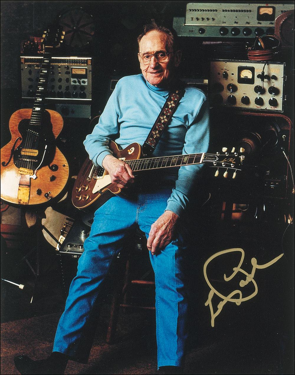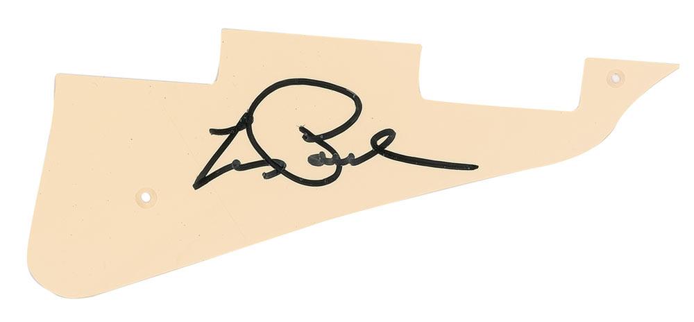 Two items: satin-finish 11 x 14 photo of Les Paul, signed in gold ink and an ivory-colored pickguard signed in black felt tip. In fine condition.