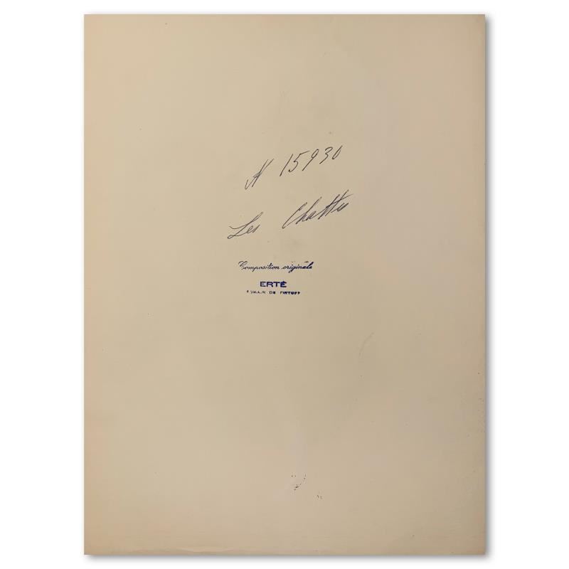 Les chatters by Erte (1892-1990). Please see photos and description for all available information. "Les chatters, deuxieme version" is an original gauche painting on paper by Erte (1892-1990), hand signed by the artist. This piece bears the stamp, title and registration number 15.930 inverso. Includes Letter of Authenticity. Measures approx. 10.5" x 14.5".