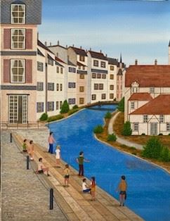 In this original 20x26" acrylic on canvas, reknowned French artist Fanch Ledan revisits his tour of the children and the bells of Strasbourg,France. Artist's COA,,