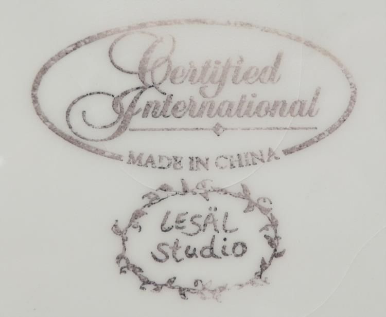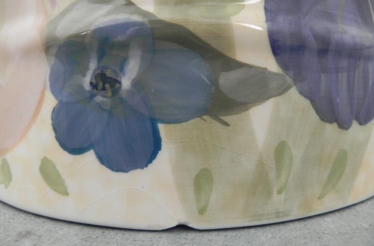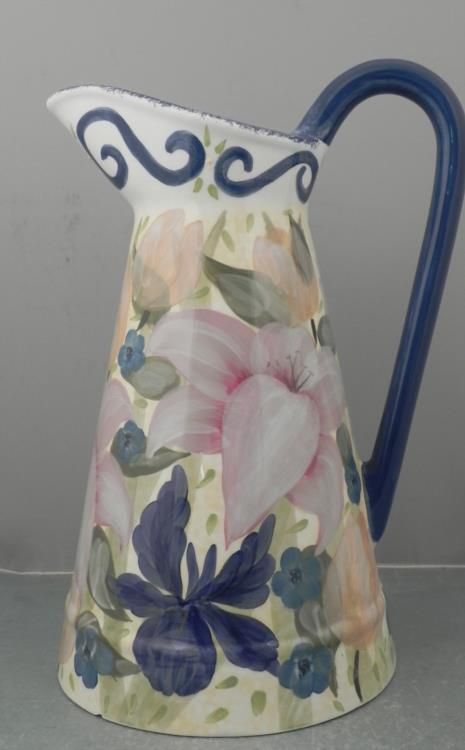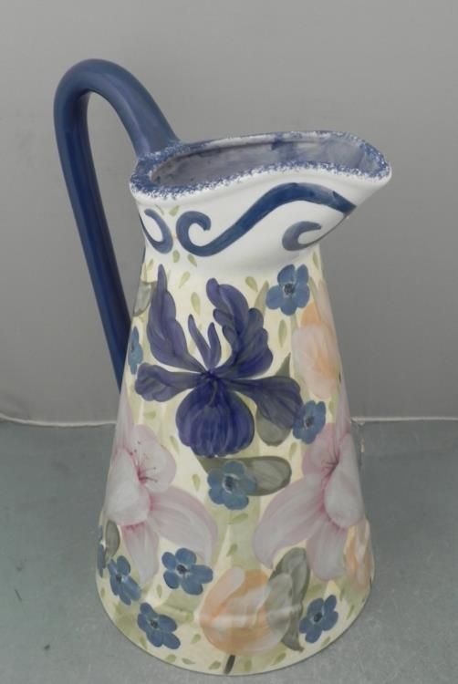 This is a large ceramic pitcher, with printed and painted patterns of pink and blue flowers on a sunny yellow background.  The dimensions are 15" tall and 9" in diameter.  There is some light crazing, and small chips around the bottom edge, but otherwise it is in very good condition.  The underside has a Lesal hallmark.  *  * This might be too large to use as a pitcher, but it would be fine for dried flowers, or by itself as a lovely display.