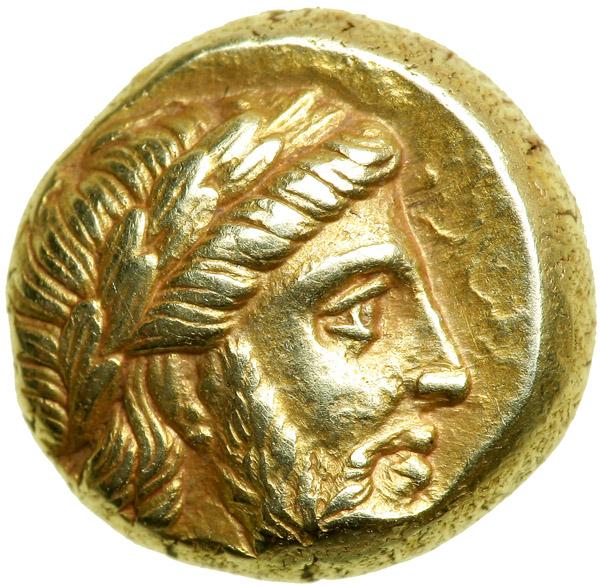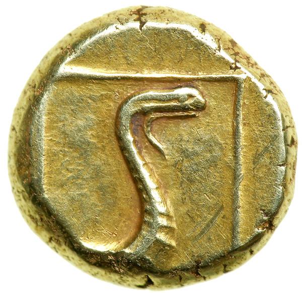 Lesbos, Mytilene, c. 377-326 BC. Electrum Hekte (2.57 g). Laureate head right of Zeus. Reverse: Snake within linear square. Bodenstedt 96 (plates 31 and 59). Reverse hairline scratch; centered a bit to bottom. Extremely Fine.