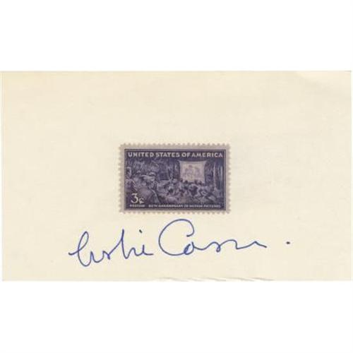 <B>Leslie Caron Autograph.</B></I> A 3" x 5" card, with a three-cent commemorative postage stamp affixed, signed by the Oscar-nominated actress in blue ink. Caron's signature extends across the base of the card and is large and clean. In Excellent condition though there are signs of handling along lower border of card (not affecting signature).<BR><BR><b>Shipping:</b> Flat Material, Small (<a target="_blank" href="http://www.heritageauctions.com/common/shipping.php">view shipping information</a>)