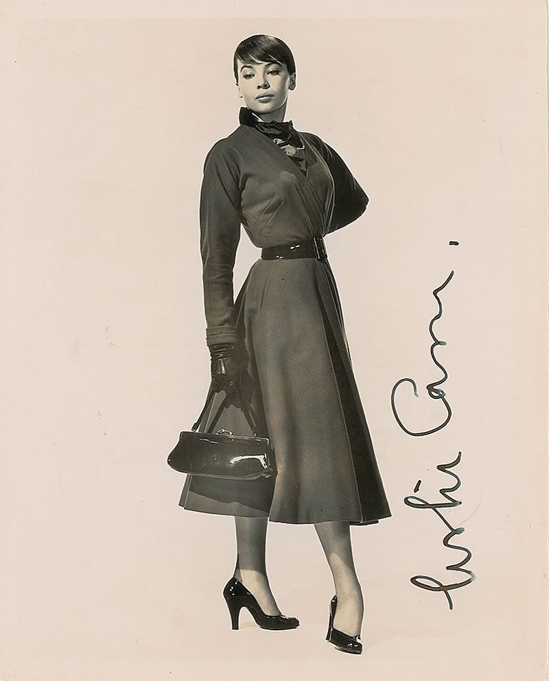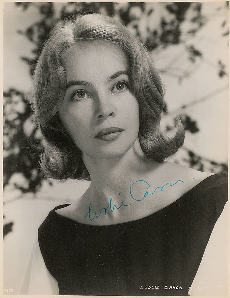 Two photos: glossy 8 x 10 full-length portrait of Caron holding a purse, vertically signed in black felt tip; and a glossy 7.25 x 9.5 head-and-shoulders photo, signed in blue ink. In overall fine condition, with slightly trimmed edges to the smaller photo.