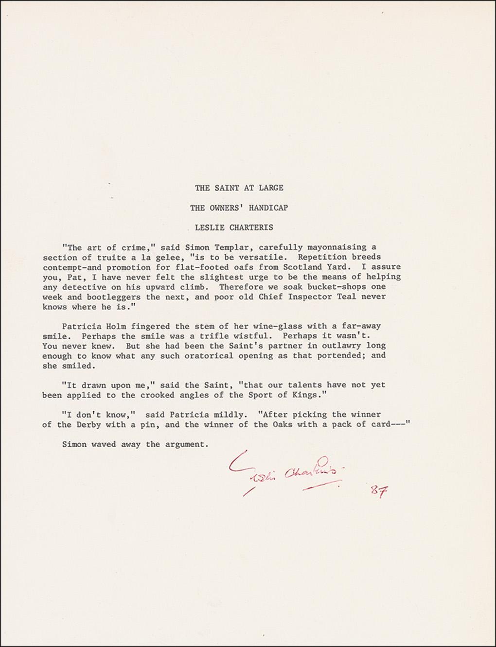 Author and creator of the suave Robin Hood-like thief Simon Templar, better known as The Saint. Souvenir typescript, one page, 8.5 x 11, taken from The Saint at Large, beginning: “’The art of crime,’ said Simon Templar, carefully mayonnaising a section of truite a la gelee, ‘is to be veritable. Repetition breeds contempt and promotion for flat-footed oafs from Scotland Yard.’” Signed at the bottom in red ink, “Leslie Charteris 87.” In fine condition, with some scattered light wrinkling.