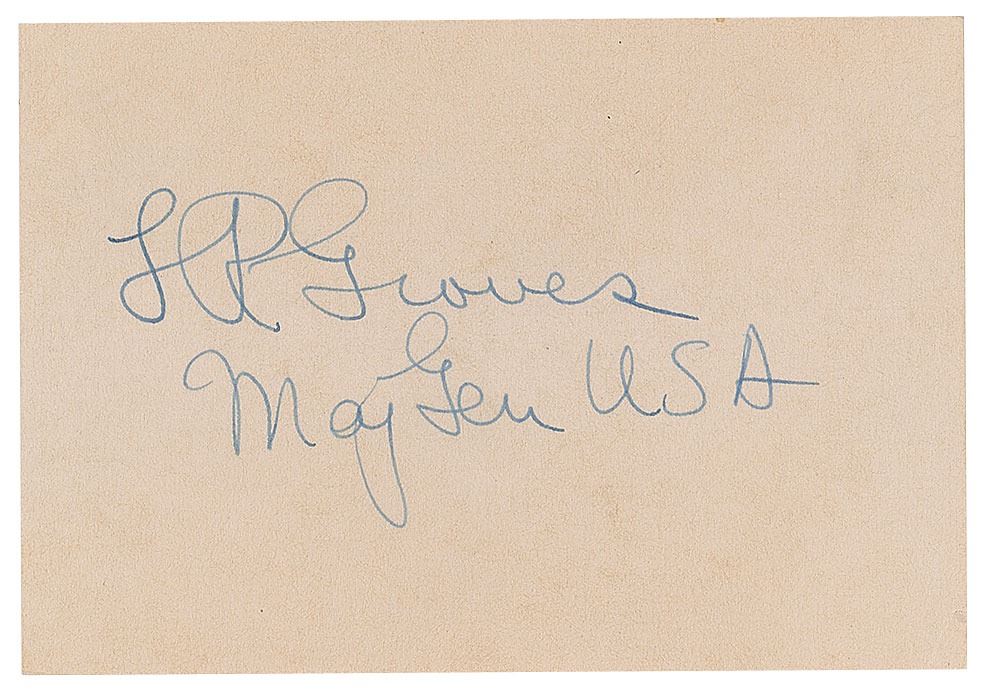 Army officer (1896–1970) who headed the Manhattan Project and oversaw the construction of the Pentagon. Fountain pen signature, "L. R. Groves, Maj. Gen. USA,” on an off-white 3.5 x 2.5 card. In fine condition. Accompanied by a letter from George Senator Richard Russell to Groves, dated June 28, 1958, expressing thanks in regard to his position "on the Atomic Transfer bill."