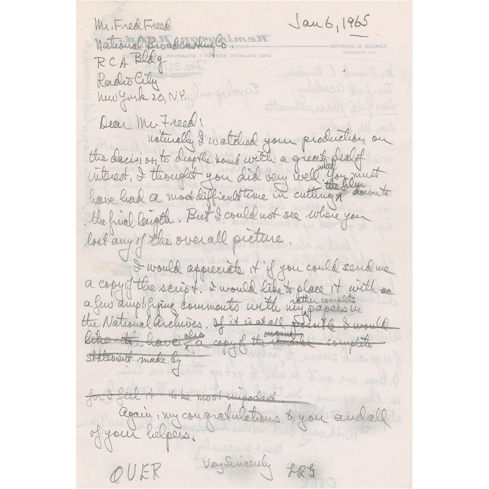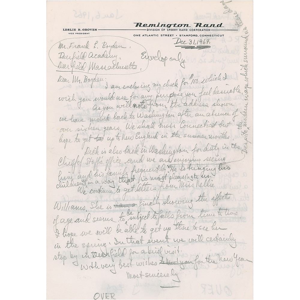 Two handwritten drafts of letters in pencil by Groves, one signed “L. R. G.,†on opposite sides of a single 7.25 x 10.5 sheet of personal letterhead, December 31, 1964 and January 6, 1965. The first, to Frank L. Boyden, headmaster of Deerfield Academy, encloses a check and discusses family matters. The second, to Fred Freed of NBC, in part: "Naturally I watched your production on the decision to drop the bomb with a great deal of interest. I thought you did very well indeed. You must have had a most difficult time in cutting the film down to the final length. But I could not see where you lost any of the overall picture. I would appreciate it if you could send me a copy of the script. I would like to place it with a few amplifying comments with my rather complete papers in the National Archives." In fine condition.