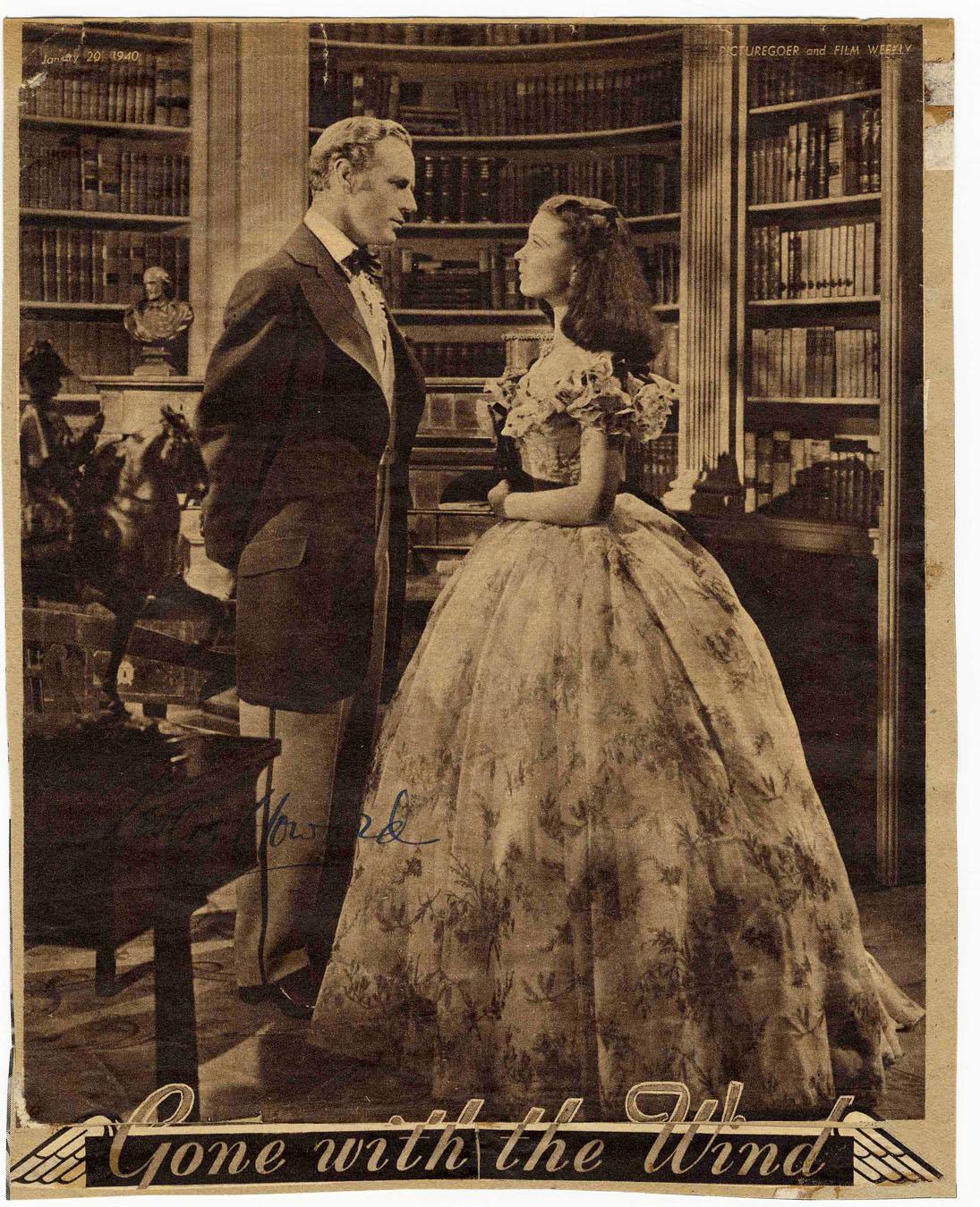 ''Gone With the Wind'' magazine photo signed by Leslie Howard. Iconic image shows Howard as Ashley standing with Vivien Leigh as Scarlett O'Hara gazing intently at one another in the library. An extremely rare magazine portrait of Howard in his most famous role. Signed in fountain pen ink, partially to a darker portion. Sepia tone, measuring approximately 7.5'' x 9.25''. Age toning, scuffing to edges, and laid down to an album page, otherwise very good condition.