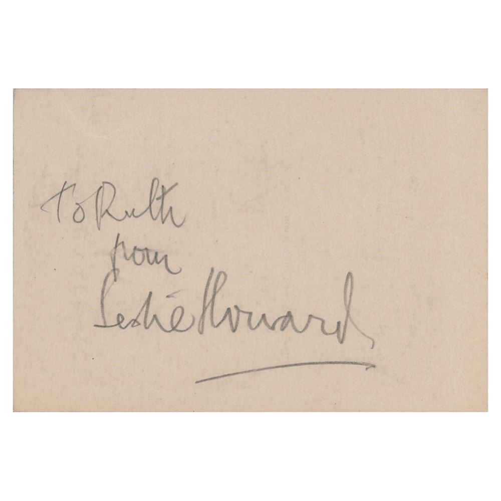 Vintage pencil signature and inscription, "To Ruth, from Leslie Howard,” on an off-white 4.75 x 3.25 card. In fine condition.