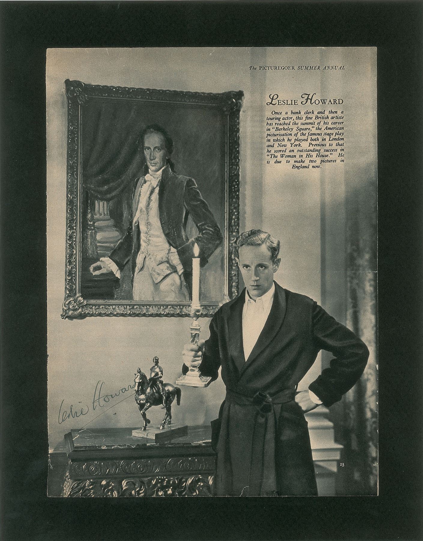 Vintage 8.5 x 11.5 magazine photo of Howard in the 1933 film Berkeley Square from the Picturegoer Summer Annual, neatly signed in fountain pen. Affixed to a larger mount and in fine condition.