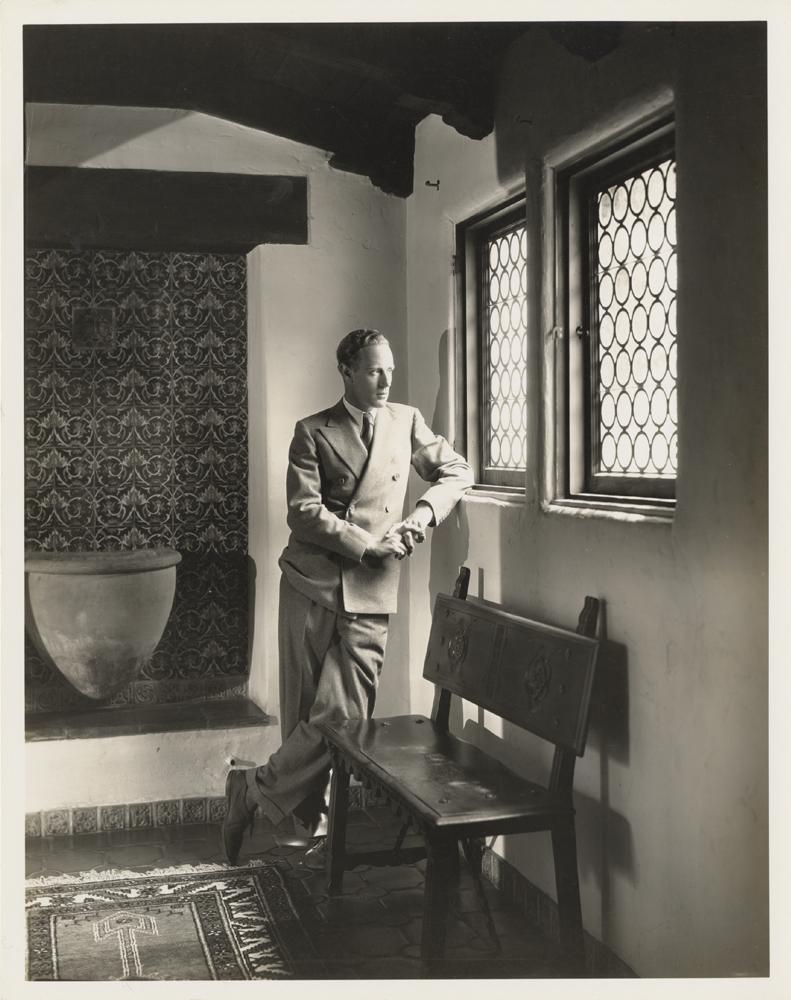 Gelatin silver glossy 8 x 10 in. print of Leslie Howard at this residence by Scotty Welbourne; with photographer rubber stamp on the verso. Fine; with crease at the upper left corner.