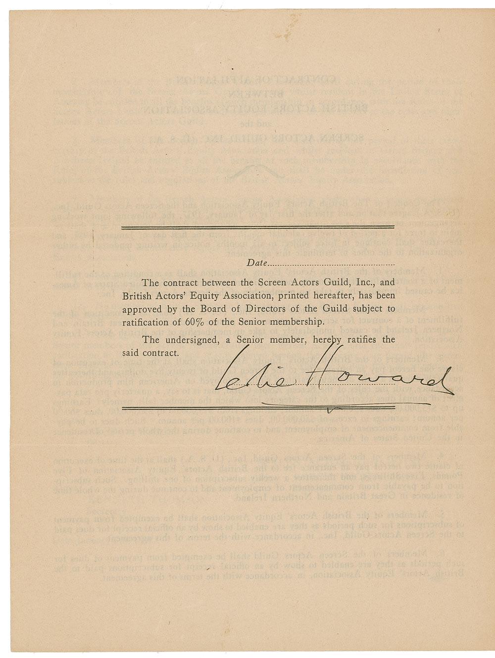 British actor (1893–1943) best remembered for his roles in such classics as the Pygmalion, The Petrified Forest, and as Ashley Wilkes in Gone With the Wind. During World War II he devoted his energies to the war effort and was killed in 1943 when the plane he was on was shot down by German fighters over the Bay of Biscay. DS, signed “Leslie Howard,” three pages on two adjoining sheets, 8.5 x 11, no date. In part: “The contract between the Screen Actors Guild, Inc. and British Actors’ Equity Association, printed hereafter, has been approved by the Board of Directors of the Guild Subject to ratification of 60% of the Senior membership. The undersigned, a Senior member, hereby ratifies the said contract.” Scattered wrinkling and light creasing, and some toning to the edges, otherwise fine condition. Howard is quite uncommon in signed documents of any type, and this is a boldly signed example.