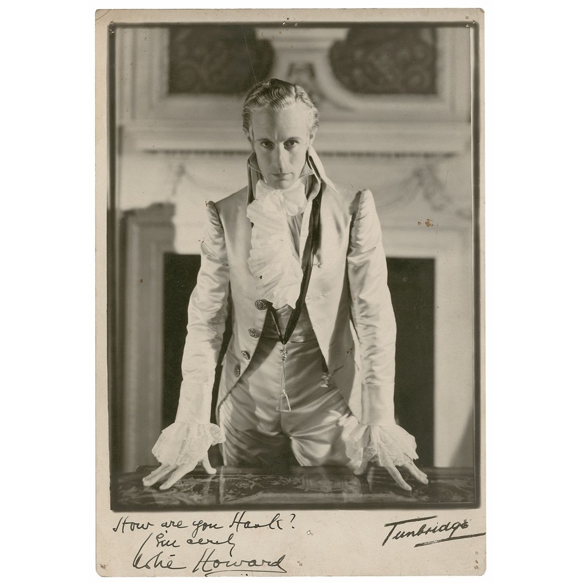 Vintage matte-finish 7.25 x 10.5 Tunbridge photo of Howard from The Scarlet Pimpernel, signed and inscribed in fountain pen “How are you Hank? Sincerely, Leslie Howard.” In very good condition, with scattered surface marks, tack holes to top and bottom edges and corners, a few small areas of surface loss to background of image, small edge creases lightly extending into signature, and light soiling to lower border. Accompanied by a letter of authenticity from James Spence.