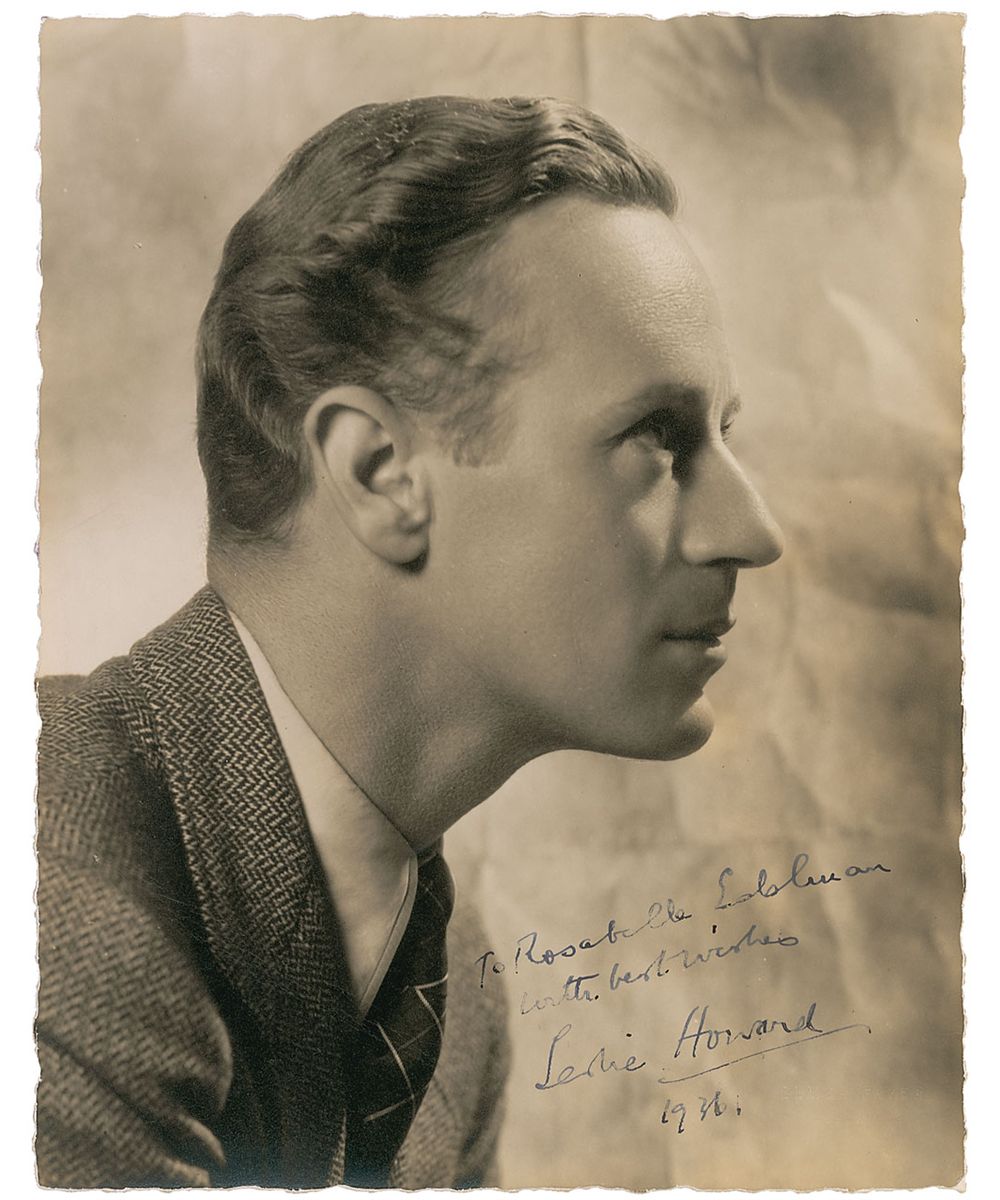 Vintage matte-finish 7.5 x 9.5 portrait of Howard in profile, signed and inscribed in fountain pen, “To Rosabelle Edelman, with best wishes, Leslie Howard, 1931.” Blindstamped in the lower right by famous Hollywood photographer Elmer Fryer. In fine condition, with a mild diagonal crease to the lower left.