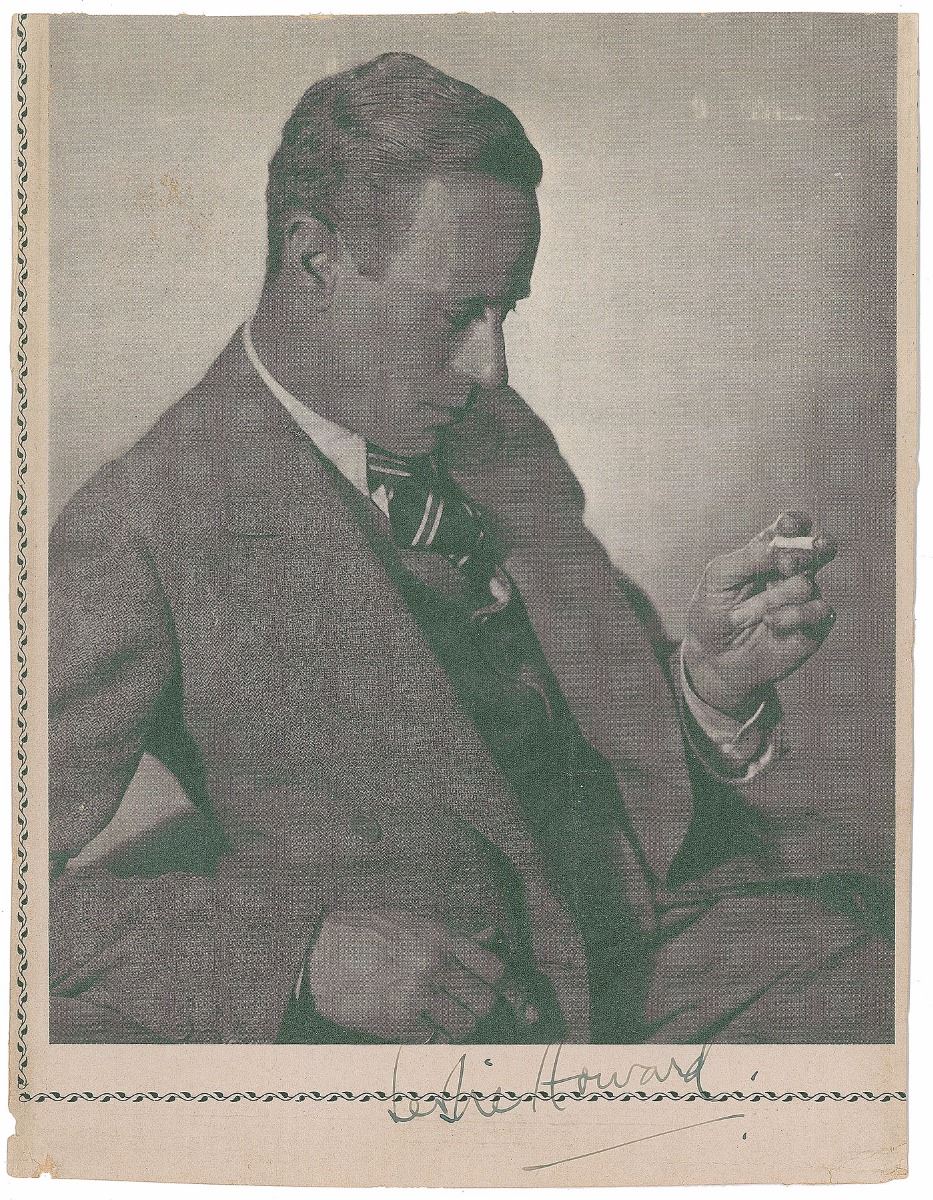 Vintage 6.75 x 9 paperstock program photo of Howard from a production of Hamlet, signed in the lower border in fountain pen. In fine condition, with trimmed edges. Accompanied by an unsigned program from Petrified Forest.