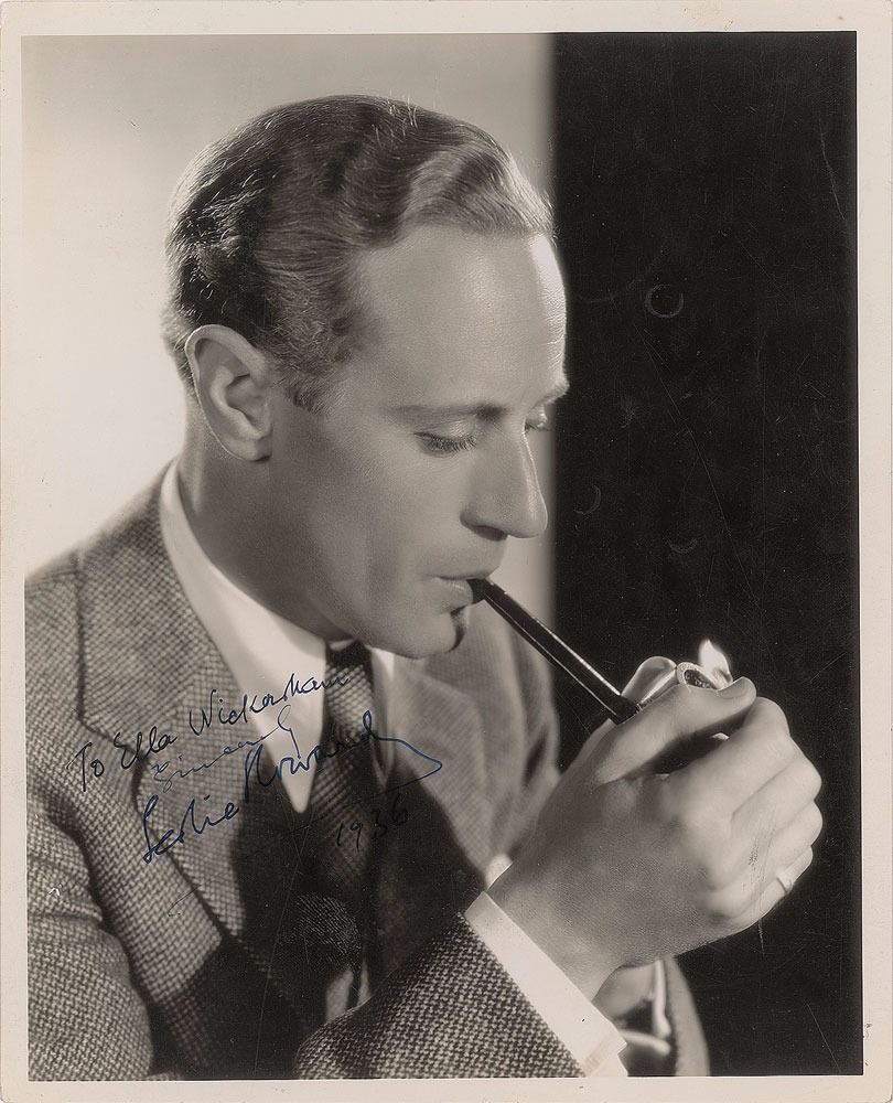 Vintage glossy 8x 10 photo of Howard lighting his pipe, signed and inscribed in fountain pen, “To Ella Wickerham, Sincerely, Leslie Howard, 1936.” Reverse bears a Scotty Welbourne photo credit stamp. In fine condition, with slight scattered surface impressions and signature contrast to “1936” against the dark background. Originates from the James Collings Collection.