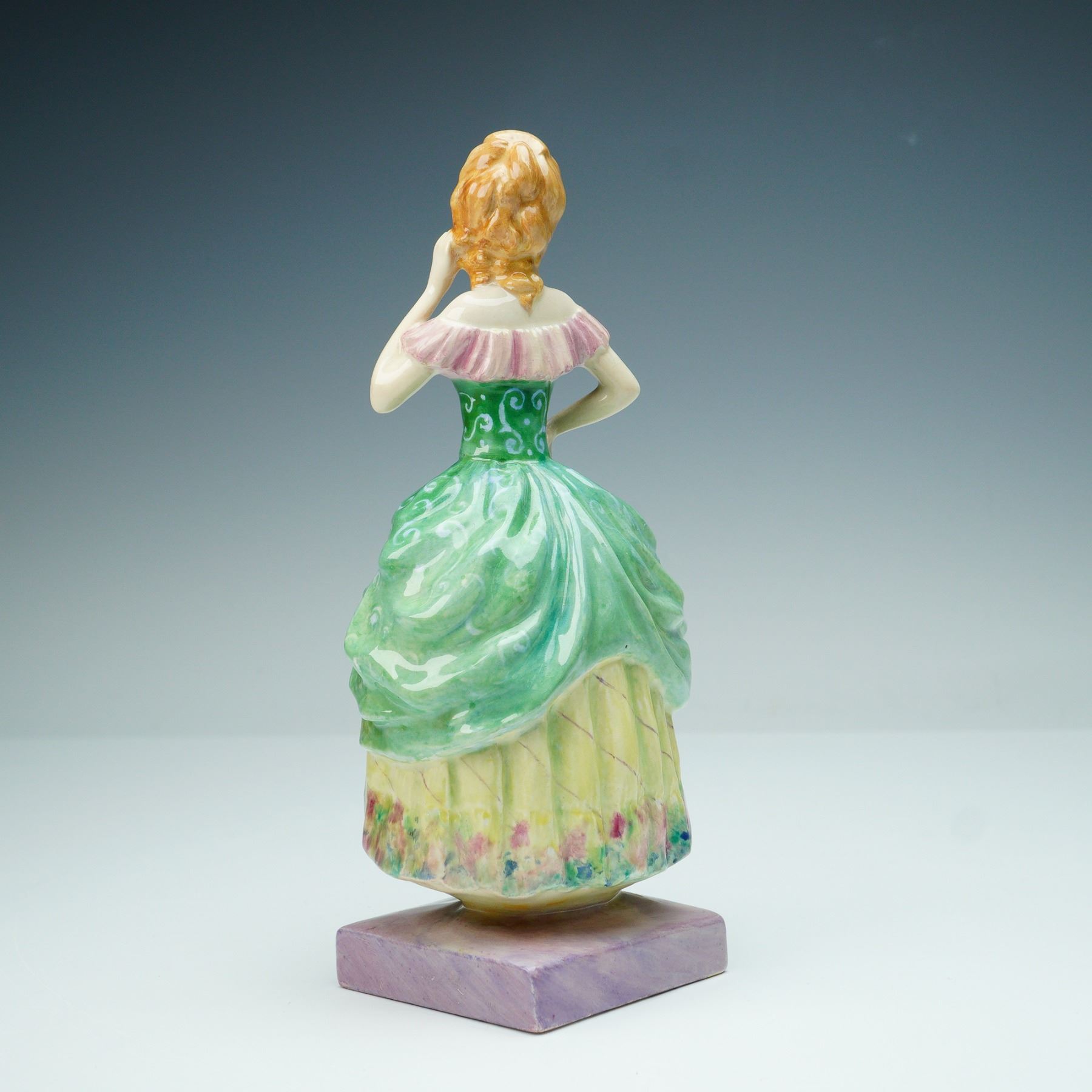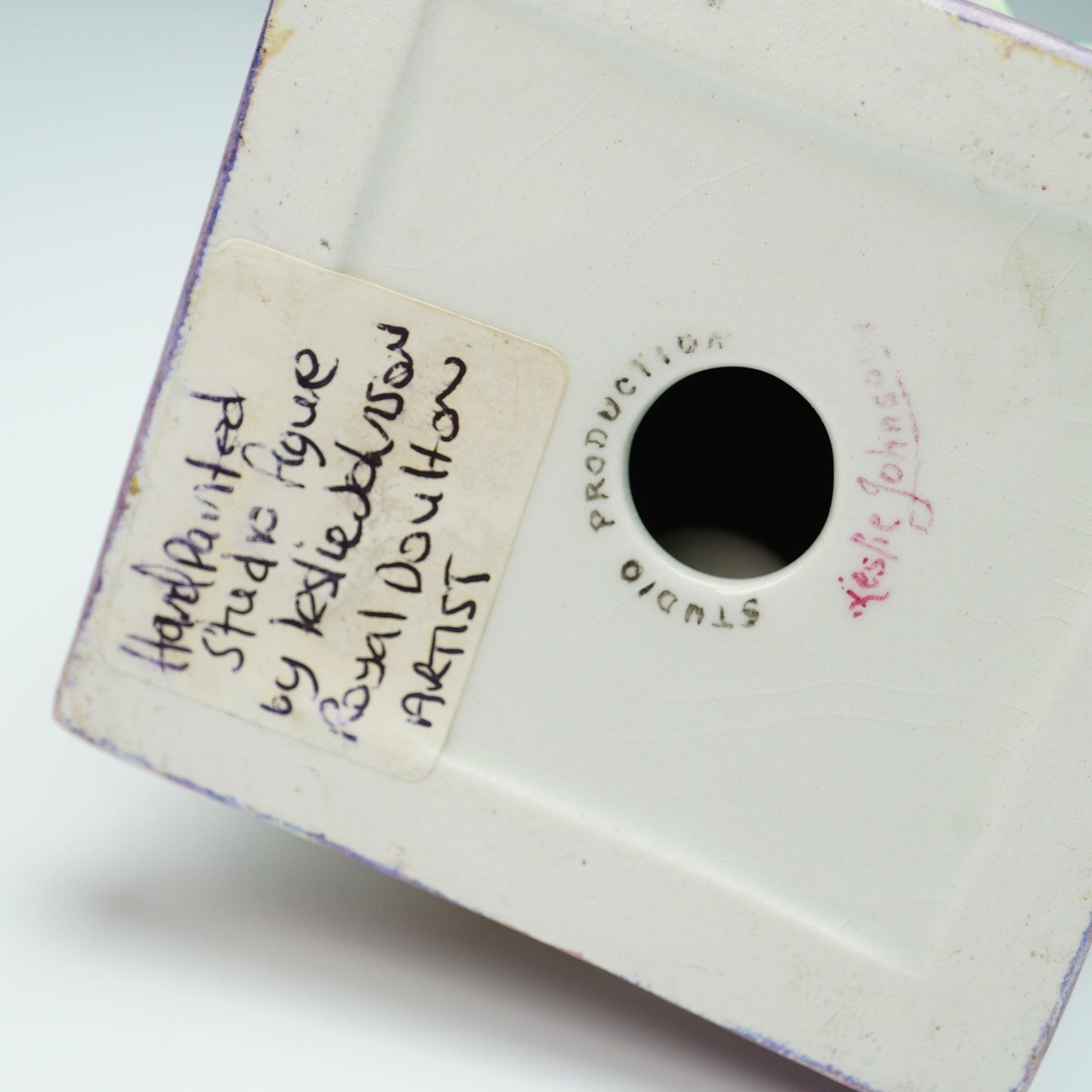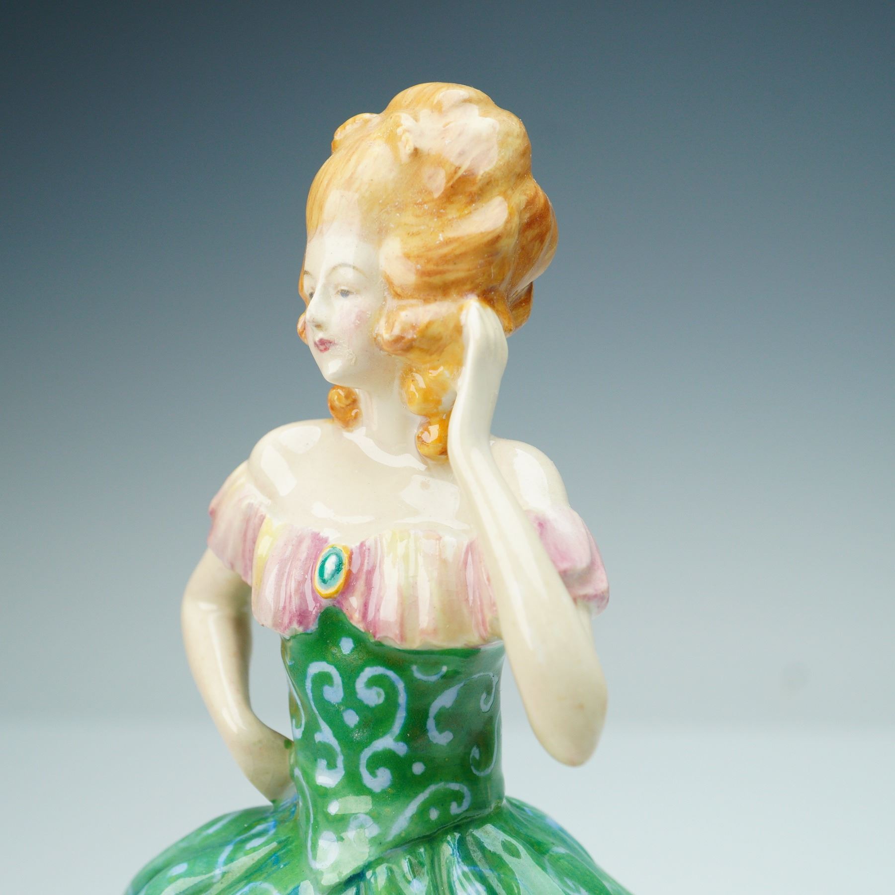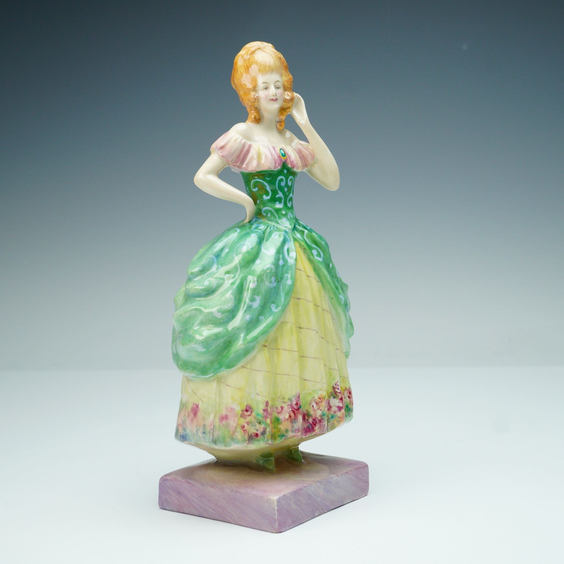 Hand-painted studio figurine depicting an elegant lady in a green and yellow gown with pink accents and floral hem detail. The figure features fine detailing to the bodice and skirt, with a raised hand pose and coiffed hair in the 18th-century style. Signed to base by Royal Doulton artist Leslie Johnson, with studio production mark and label noting hand painted decoration.