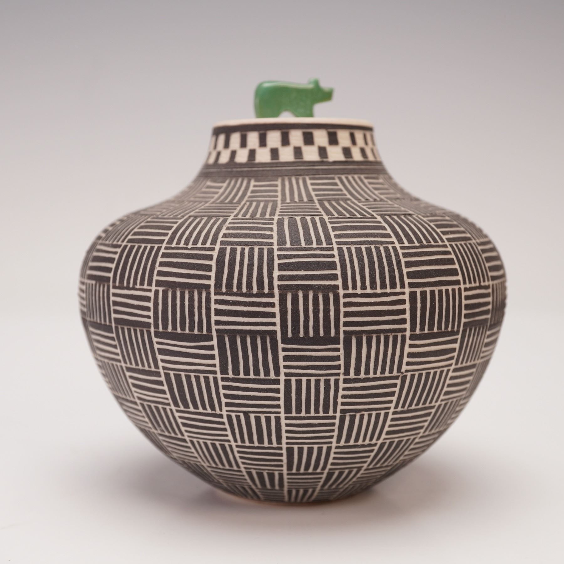 This vase by Leslie Kent Thompson features a bold geometric surface of alternating vertical and horizontal lines that form a rhythmic woven pattern. A band of small checker motifs circles the neck, leading to a smooth lid topped with a small green bear figure. The precise patterning and playful finial create a balanced and distinctive design. Marked Kent.