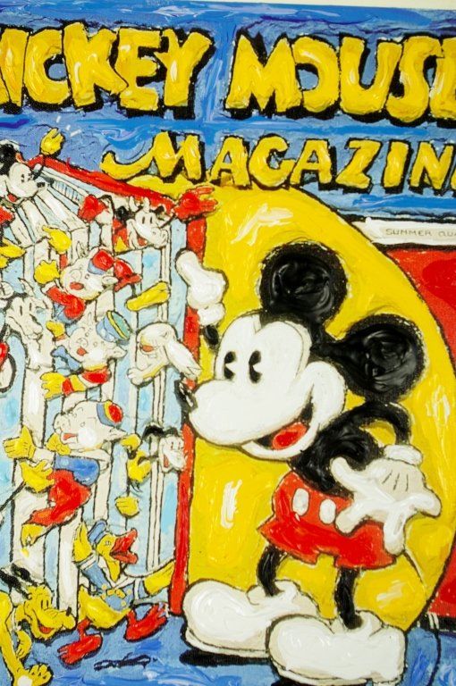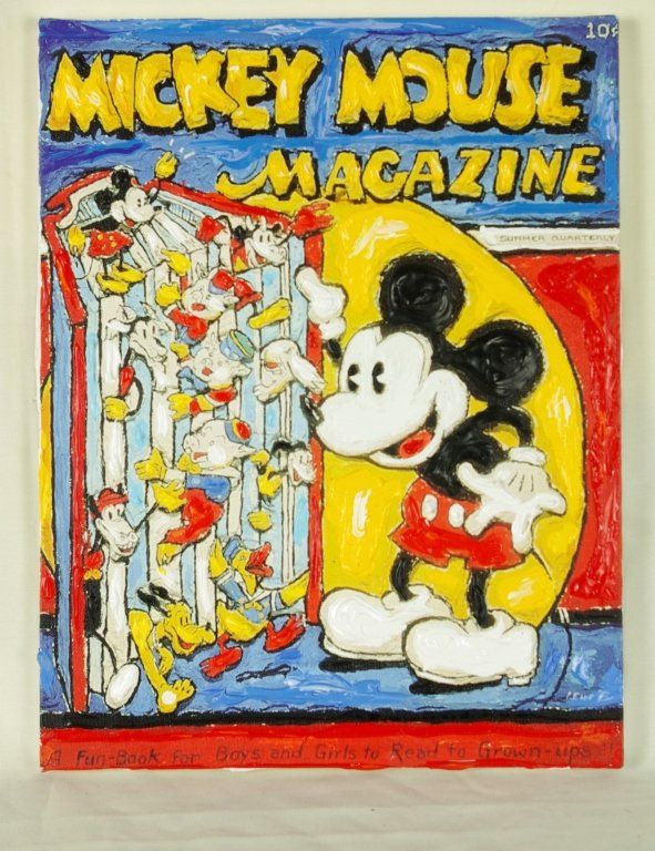 Leslie Lew (American, b. 1953) , One of a kind, Original Sculpted Oil on canvas - Title: Reading Mickey, Hand signed by the artist in the lower margin, also hand signed and titled on verso. Stretched canvas, overall approx 18 x 14 inches. The artist worked along side of Andy Warhol for many years. Condition: Excellent