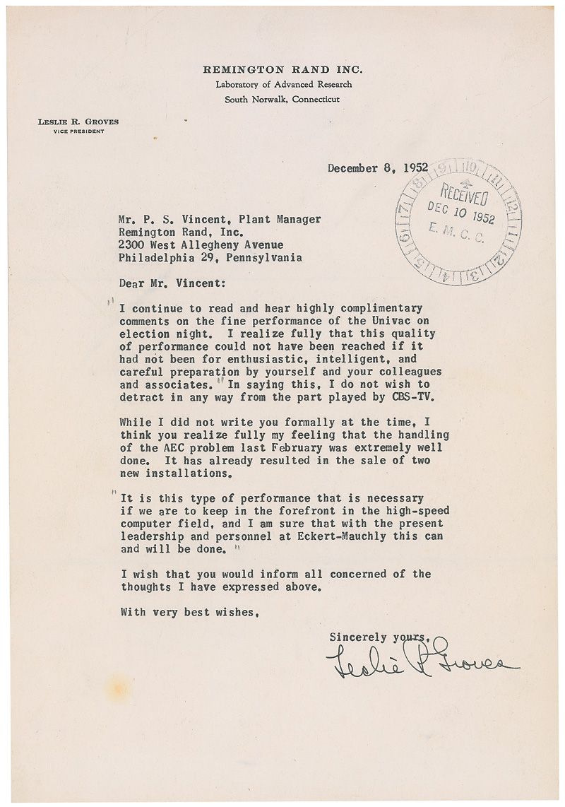 Army officer (1896–1970) who headed the Manhattan Project and oversaw the construction of the Pentagon. TLS, one page, 7.25 x 10.5, Remington Rand Inc. letterhead, December 8, 1952. A letter to a Remington Rand plant manager. In full: “I continue to hear highly complimentary comments on the fine performance of the Univac on election night. I realize fully that this quality of performance could not have been reached if it had not been for enthusiastic, intelligent, and careful preparation by yourself and your colleagues and associates. In saying this, I do not wish to detract in any way from the part played by CBS-TV. While I did not write you formally at the time, I think you realize fully my feeling that the handling of the AEC problem last February was extremely well done. It has already resulted in the sale of two new installations. It is this type of performance that is necessary if we are to keep in the forefront in the high-speed computer field, and I am sure that with the present leadership and personnel at Eckhart-Mauchly this can and will be done.” In fine condition, with a spot of toning to the lower left, trivial creases to the top edge, and a few pencil notations to the text.