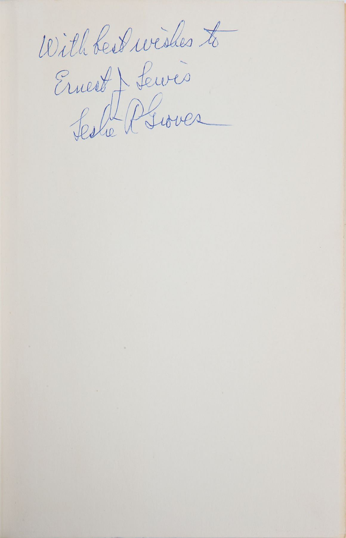Army officer (1896-1970) who headed the Manhattan Project and oversaw the construction of the Pentagon. Signed book: Now It Can Be Told. First edition. NY: Harper & Row Publishers, 1962. Hardcover with dust jacket, 6 x 8.5, 464 pages. Signed and inscribed on the first free end page in blue ballpoint, "With best wishes to Ernest J. Lewis, Leslie R. Groves." In fine condition, with tears and paper loss to the dust jacket.