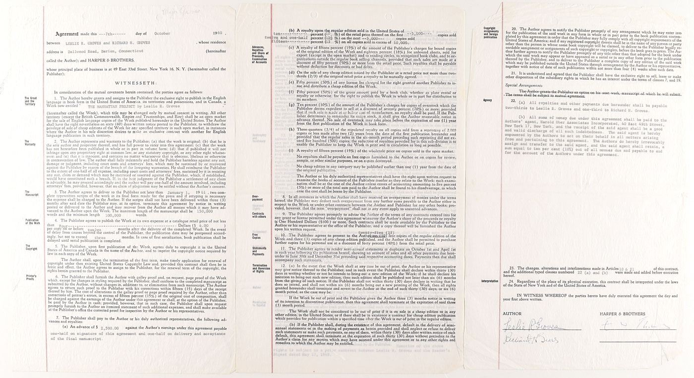 Army officer (1896–1970) who headed the Manhattan Project and oversaw the construction of the Pentagon. DS, signed “Leslie R. Groves,” three pages, 8.5 x 13.75, October 7, 1960. Publication contract between Groves and Harper & Brothers for "a Work now entitled 'The Manhattan Project by Leslie R. Groves,'" to be between 100,000 and 150,000 words, and sold at a retail price of not less than $4.00. The contract outlines the terms for an advance of $2,500, as well as future royalties to be split between Groves and his son, Richard H. Groves. Signed at the conclusion in ballpoint by Leslie R. Groves, his son Richard H. Groves, and an official from Harper & Brothers. In fine condition, with usual document wear. Groves's history of the Manhattan Project was released in 1962, under the title Now It Can Be Told: The Story of the Manhattan Project.