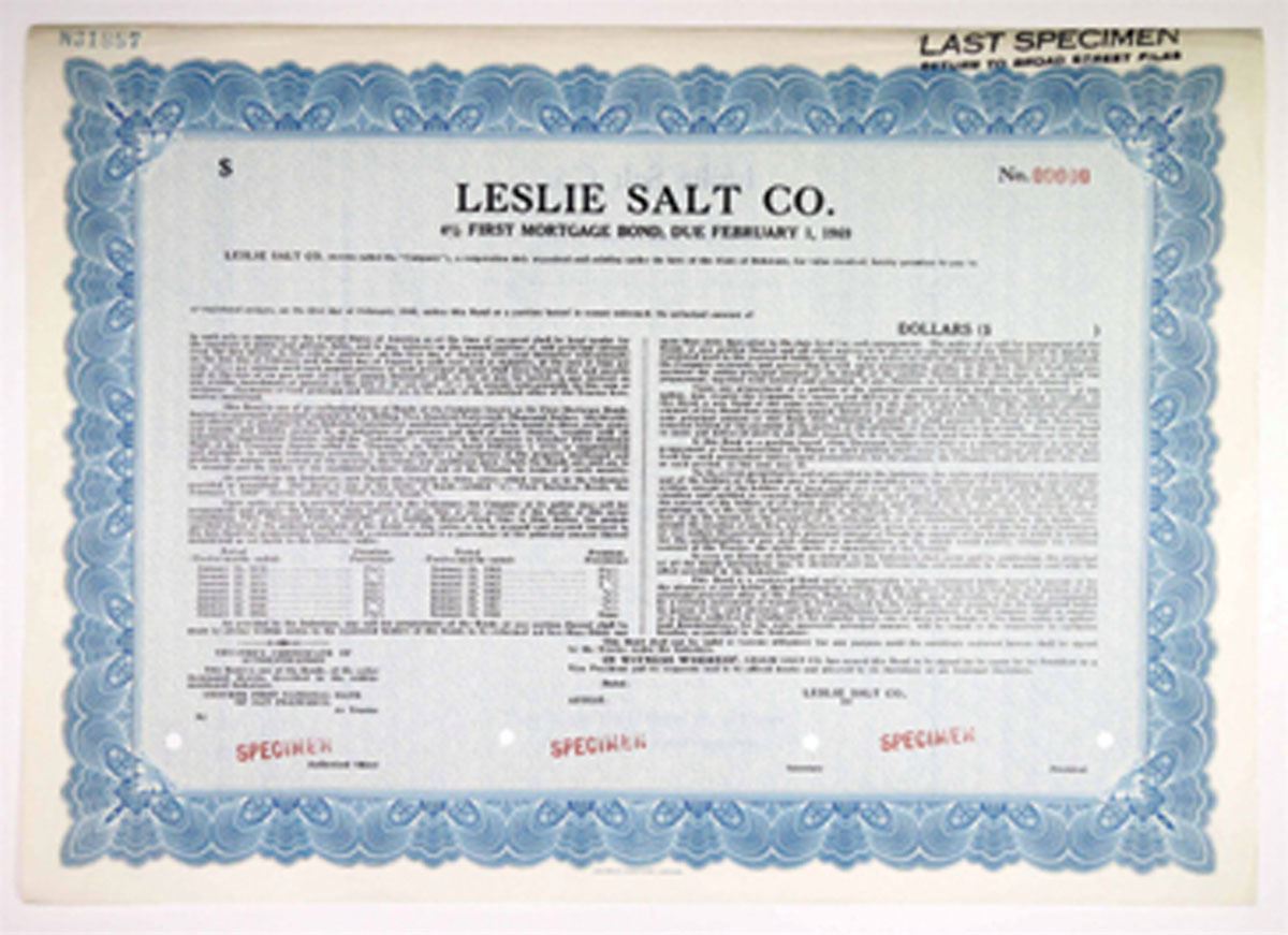 Leslie Salt Co., 1952 $Odd Specimen 4% First Mortgage Bond, VF-XF ABN Blue. The Leslie Salt Company was a salt-producing company located in the San Francisco Bay Area, at the current locations of Newark, Hayward and other parts of the bay. They produced salt using salt evaporation ponds on the shores of the San Francisco Bay.
